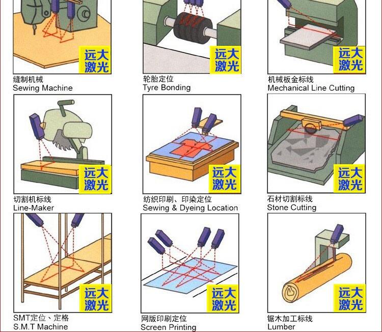 木材:(單片縱鋸機(jī),多片縱鋸機(jī),四邊鋸,推臺鋸,多片鋸,金屬切割機(jī),金屬鋸床等各種鋸機(jī)的劃線定位燈等各種鋸床)加工行業(yè):在預(yù)切木材前提供準(zhǔn)直指示線。