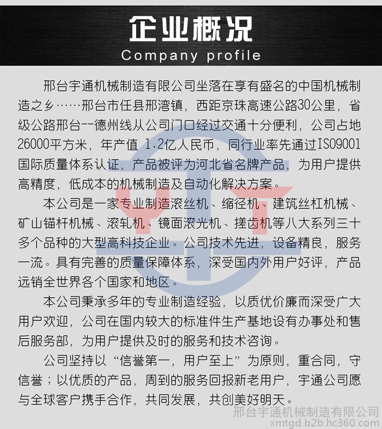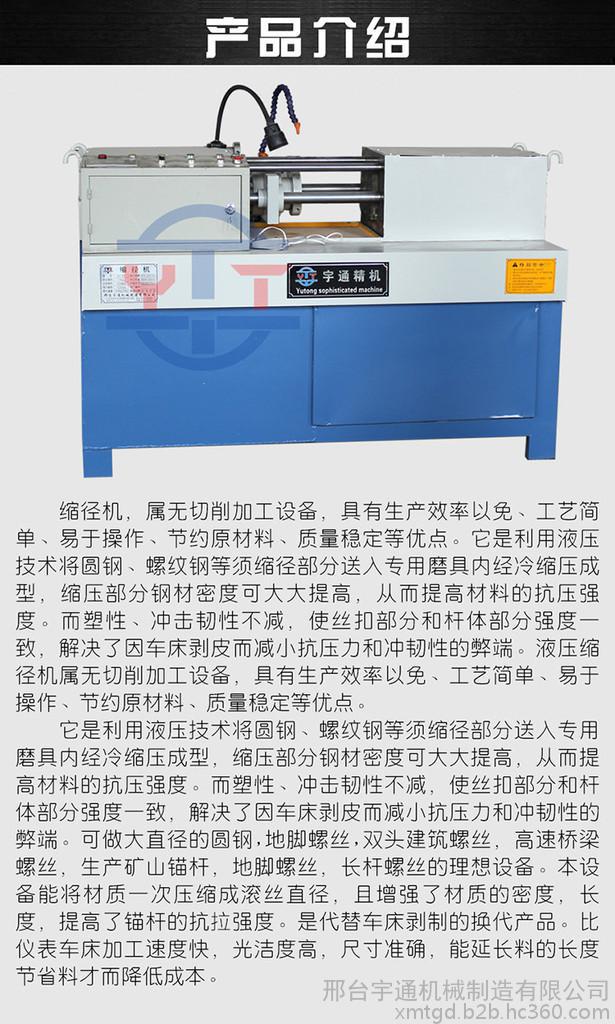 河北省邢臺(tái)宇通機(jī)械專業(yè)生產(chǎn)滾絲機(jī),三軸滾絲機(jī),大型滾絲機(jī),縮徑機(jī)。尤其**開發(fā)出幾種新型滾絲機(jī),大型滾絲機(jī),在精度上與加工范圍內(nèi)得到了質(zhì)的飛躍,可根據(jù)各廠家的不同要求特殊設(shè)計(jì)制造非標(biāo)機(jī)型來滿足客戶。