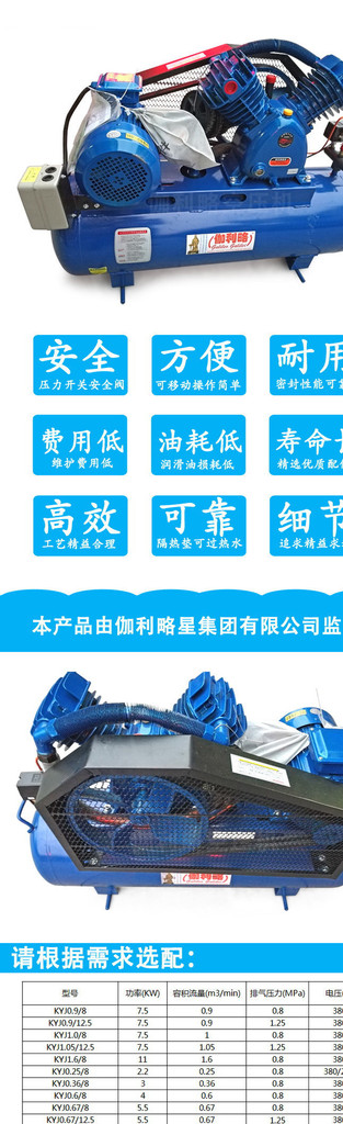 型號 功率(KW) 容積流量(m3/min) 排氣壓力(MPa) 電壓(V) KYJ0.9/8 7.5 0.9 0.8 380 KYJ0.9/12.5 7.5 0.9 1.25 380 KYJ1.0/8 7.5 1 0.8 380 KYJ1.05/12.5 7.5 1.05 1.25 380 KYJ1.6/8 11 1.6 0.8 380 KYJ0.25/8 2.2 0.25 0.8 380/220 KYJ0.25/12.5 2.2 0.25 12.5 380/220 KYJ0.36/8 3 0.36 0.8 380 KYJ0.6/8 4 0.6 0.8 380 KYJ0.67/8 5.5 0.67 0.8 380 KYJ0.67/12.5 5.5 0.67 12.5 380