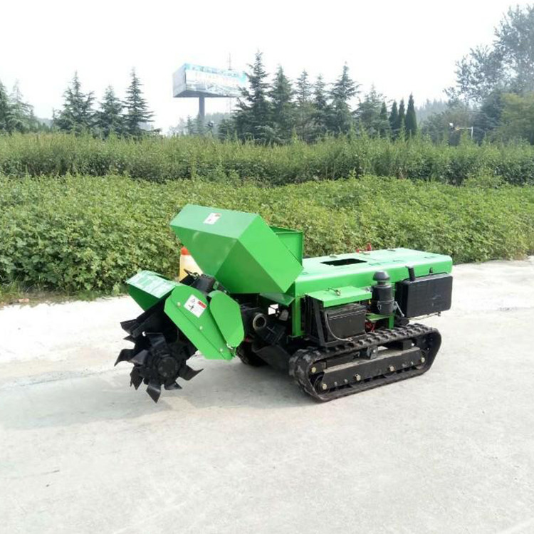履帶式果園開溝機(jī)視頻 全自動果園施肥機(jī) 自走式果園開溝施肥機(jī)生態(tài)果園開溝施肥機(jī) 機(jī)械化管理開溝機(jī)果樹開溝施肥機(jī)價格果樹開溝施肥機(jī)廠家葡萄開溝施肥機(jī) 開溝機(jī)廠家本機(jī)主要由變速箱、機(jī)架、履帶、傳動箱、發(fā)動機(jī)、開溝機(jī)、施肥箱、排肥器等組成,其結(jié)構(gòu)見圖1。該機(jī)工作原理是:發(fā)動機(jī)輸出兩路動力,通過三角帶一路傳給變速箱,通過齒輪傳動驅(qū)動機(jī)器行走。一路傳給傳動箱,通過齒輪傳動驅(qū)動開溝機(jī)工作。使用農(nóng)家肥時,開溝機(jī)將土拋到溝的兩側(cè),人工將肥料放到溝里后,可通過更換回填機(jī)將土回填;使用復(fù)合肥時通過更換刀具和護(hù)罩,施肥后直接將土回填,一次性完成施肥作業(yè)。通過更換箱體本機(jī)還可完成旋耕、除草、回填等作業(yè)。提高了機(jī)器的利用率。