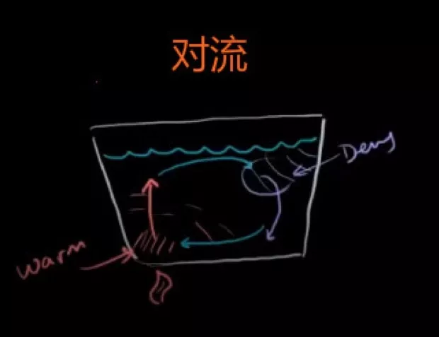 在火焰上方的水比其他地方更熱,加熱的水分子加速運動,增加了彼此間的距離,所以該處的密度減小,周圍物質(zhì)就相對更密集。熱的、密度小的水向上運移,下方就有更冷的水從另一端移動過來補充,這就形成了一個循環(huán):熱的水上升移動到右上方,之后由于降溫密度增大而下沉,然后再次被加熱。這個過程本質(zhì)上是熱傳遞,稱為對流。