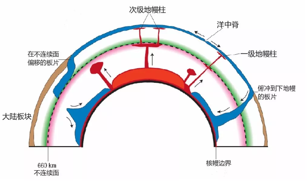但是,隨著地學(xué)家們對地幔對流認(rèn)識的加深,地幔對流的模型成為了學(xué)術(shù)界爭論的一個焦點,全地幔對流還是分層對流?結(jié)果是地震學(xué)、地球動力學(xué)的研究傾向于全地幔對流模型,而地球化學(xué)研究則支持分層地幔對流。在地下410km到660km是地幔轉(zhuǎn)換帶,這是上地幔和下地幔的分界面,全地幔對流和分層對流兩種模型爭議的關(guān)鍵在于對流是否能穿透地幔轉(zhuǎn)換帶。