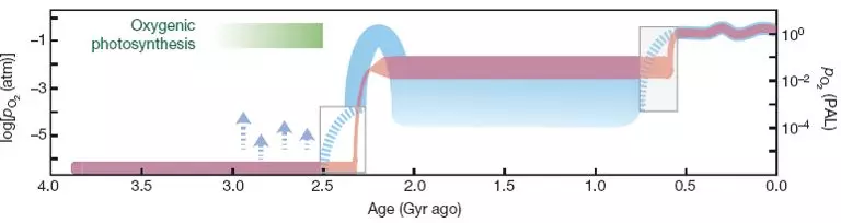 約24.5億年氧氣突然增高(Ga為十億年)