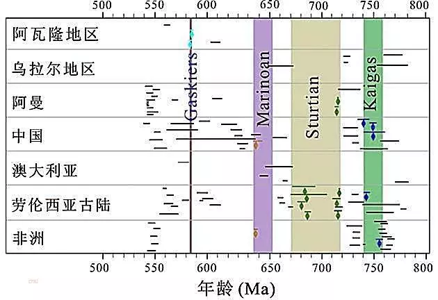 新元古代冰期發(fā)生的次數(shù)、年齡、分布范圍,以及其成因機制等問題還存在著很大的爭議,所以設(shè)立了IGCP-512國際對比計劃,協(xié)調(diào)各國的研究?茖W家通過冰川沉積物的成分、結(jié)構(gòu)、構(gòu)造認識古冰川活動遺跡,應用一些地球化學的指標和給巖石或地層測定年齡的手段,最終確定新元古代時期有4次冰期,并限定了每個冰期的大致時間范圍,其中有兩次是全球性的冰期——Sturtian冰期(司圖特冰期,7.18~6.60億年)和Marinoan冰期(馬林諾冰期,6.51~6.35億年),和另外兩次小的或是局部的冰期——Kaigas冰期(凱噶斯冰期,7.57~7.41億年)和Gaskiers冰期(噶斯奇厄斯冰期,5.837~5.821億年)。Marinoan冰期的全球化程度最高,對應于通常所說的“雪球地球”事件。