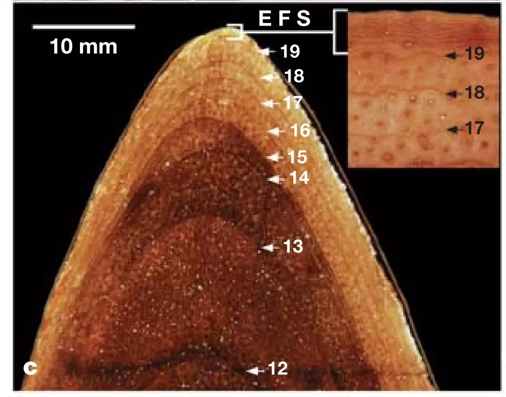 雷克斯暴龍骨組織切片當(dāng)中的“生長標(biāo)記”,這種標(biāo)記被稱為“生長停滯線”。圖上標(biāo)的數(shù)字就是年齡。(圖片來源:Erickson et al., 2004)