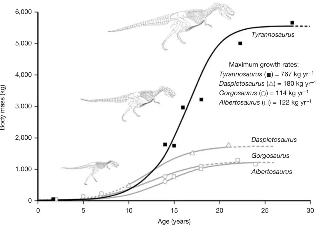 結(jié)合“生長標(biāo)記”的年齡信息,和體重估計信息,就可以得到恐龍的生長曲線了。如圖是Erickson 構(gòu)建的關(guān)于幾種暴龍類恐龍的生長曲線,由此可見雷克斯暴龍長得比其他恐龍大的主要原因是快速生長期長得非常快。