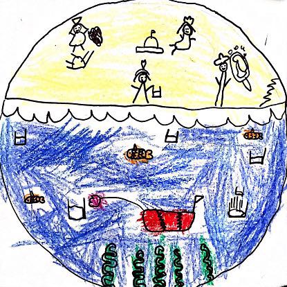 在向大家介紹這幅畫時(shí),她寫到“我在三亞的時(shí)候,在沙灘上玩的很開心。沙灘上有很多人,深海里有很多的魚,它們不小心就會吃掉很多垃圾死掉,都是沙灘上玩的人扔的。我希望有一個(gè)深海潛水垃圾艇,它可以把所有垃圾吸走,這樣小魚就不會死了。”