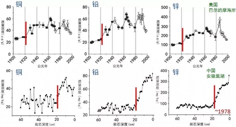 在上個世紀(jì),兩次世界大戰(zhàn)刺激產(chǎn)生了很多新技術(shù),如有機(jī)化工、核能、計(jì)算機(jī)、噴氣式飛機(jī)等,這使歐美資本主義國家的生產(chǎn)力率先飛速發(fā)展。而在我國,直到1978年“改革開放”之后,這些技術(shù)才在經(jīng)濟(jì)建設(shè)中得到廣泛應(yīng)用。地層記錄了這個時間差。在美國巴爾的摩港的沉積巖芯中,常用的工業(yè)金屬銅、鋅、鉛的濃度在1920年后就有了明顯的增長。而我國安徽巢湖的巖芯記錄中,這三種金屬在1978年后才有了顯著的增長。