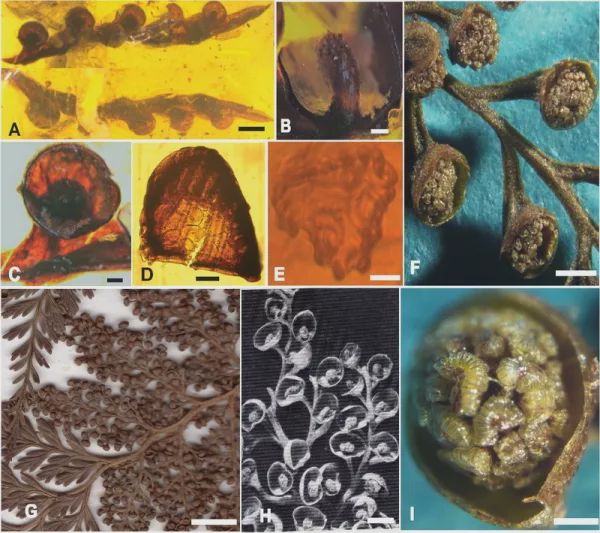 ——白堊密錐蕨化石(A-E)與現(xiàn)存密錐蕨(F-I)