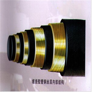 主要由耐液體的內(nèi)膠層、中膠層、2或4或6層鋼絲纏繞增強(qiáng)層、外膠層組成,內(nèi)膠層具有使輸送介質(zhì)承受壓力,保護(hù)鋼絲不受侵蝕的作用,外膠層保護(hù)鋼絲不受損傷,鋼絲(φ0.3--2.0增強(qiáng)鋼絲)層是骨架材料起增強(qiáng)作用。