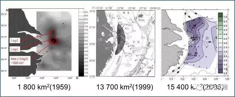 我國(guó)在長(zhǎng)江口、椒江口、珠江口等城市化程度高、人口密集城市的海岸地區(qū)、近海岸河口區(qū)域以及部分海灣均有發(fā)現(xiàn)低氧區(qū)?茖W(xué)家們發(fā)現(xiàn)長(zhǎng)江河口外的底層低氧區(qū)面積已高達(dá)13700平方公里、平均厚度高達(dá)20米,其含氧量最低值每升海水只含1毫克,低溶氧區(qū)域的虧損氧總量達(dá)到了1590000 噸。