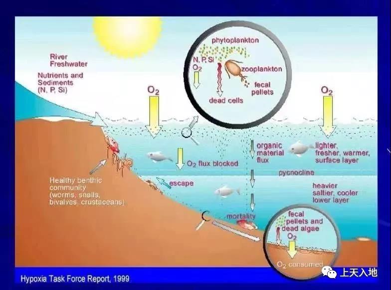 什么是水體缺氧? 當(dāng)海水中氧氣的消耗速率大于氧氣的補(bǔ)充速率時(shí),就引發(fā)水體缺氧。缺氧(hypoxia) 又稱低氧,是指水體中溶解氧含量低于每升2毫克的狀態(tài),僅相當(dāng)于正常海水溶解氧飽和狀態(tài)時(shí)的18% 。若水體溶解氧含量為0則稱之為無(wú)氧( anoxia) 。近海河口水體溶解氧含量低至缺氧狀態(tài),導(dǎo)致生態(tài)狀況急劇惡化,魚、蝦等很多水生生物都無(wú)法正常生活;同時(shí),由于表層沉積物的氧化性環(huán)境遭到破壞,積聚在沉積物中的有毒、有害化學(xué)物質(zhì)可能重新活化,釋放到水體中,形成二次污染。海洋低氧區(qū)或缺氧區(qū)又被稱為海洋“死亡區(qū)”,因?yàn)樯镫y以在低氧或缺氧狀態(tài)下存活;、畜禽糞便和生活污水等排泄入海,為海洋藻類浮游植物提供了充足的養(yǎng)料,刺激浮游植物瘋狂生長(zhǎng)。浮游植物經(jīng)歷短暫生命后,快速死亡,在水體中降解消耗溶解氧,這與空氣污染因素一起導(dǎo)致海洋中的氧被大量消耗,使海洋中形成低氧區(qū)甚至缺氧區(qū)。缺氧水體中,硫酸鹽還原菌能將硫酸鹽和一些含硫化合物還原為具有毒性的硫化氫進(jìn)一步影響水生生物生長(zhǎng)。