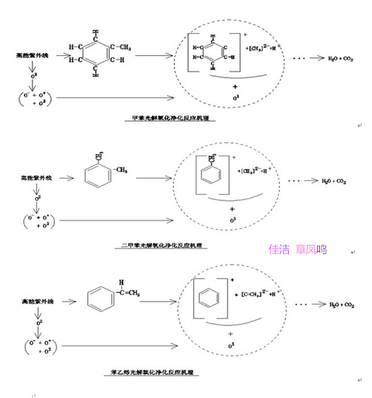 研究表明:活性自由基•OH 的氧化電位(2.8eV)比氧化性j強(qiáng)的臭氧的氧化電位(2.07eV)還高出35%。•OH 自由基與有機(jī)物的反應(yīng)速度高出幾個(gè)數(shù)量級(jí)。而且•OH自由基對(duì)氧化污染物的反應(yīng)是無(wú)選擇性的,可引發(fā)鏈?zhǔn)椒磻?yīng),直接將污染空氣中的大部分有h物質(zhì)氧化為二氧化碳和水或礦物質(zhì)。其作用機(jī)理如下: