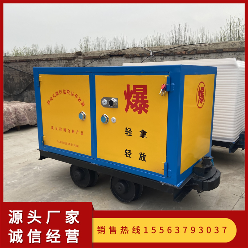 爆炸物品在運輸過程中應(yīng)用車輛直接運送到井口,直接轉(zhuǎn)裝煤礦用爆炸物品專用車運到井下,不應(yīng)在地面進行二次轉(zhuǎn)運。罐籠運輸爆炸物品時,采用專業(yè)的煤礦用爆炸物品專用車;不能將裸露的爆炸物品或者原廠包裝箱內(nèi)的爆炸物品直接放到罐籠運輸;也不能與其他物品混裝;事前通知絞車司機和井上,下把鉤工;不在交接班或者人員集中的時間運輸爆炸物品;不與爆炸物品同罐乘坐人員;電雷管和炸藥分開運送。邦泰礦用運輸車主要分為兩部分組成:第一部分是礦用移動式危險品 放箱,門板 煤礦井 6.0mm~8.0mm厚防爆鋼 ,內(nèi)置10.0mm內(nèi)襯木板和2.0mm厚防火防震防靜電的阻燃墊。第二部分為專用礦車,礦車軌距(600mm/762mm/900mm),滿足大部分礦山井上井下軌道運輸爆破器材的要求,整車集儲存,運輸于一體的動能,具有防爆、防震、防盜、防火、防靜電等特點。