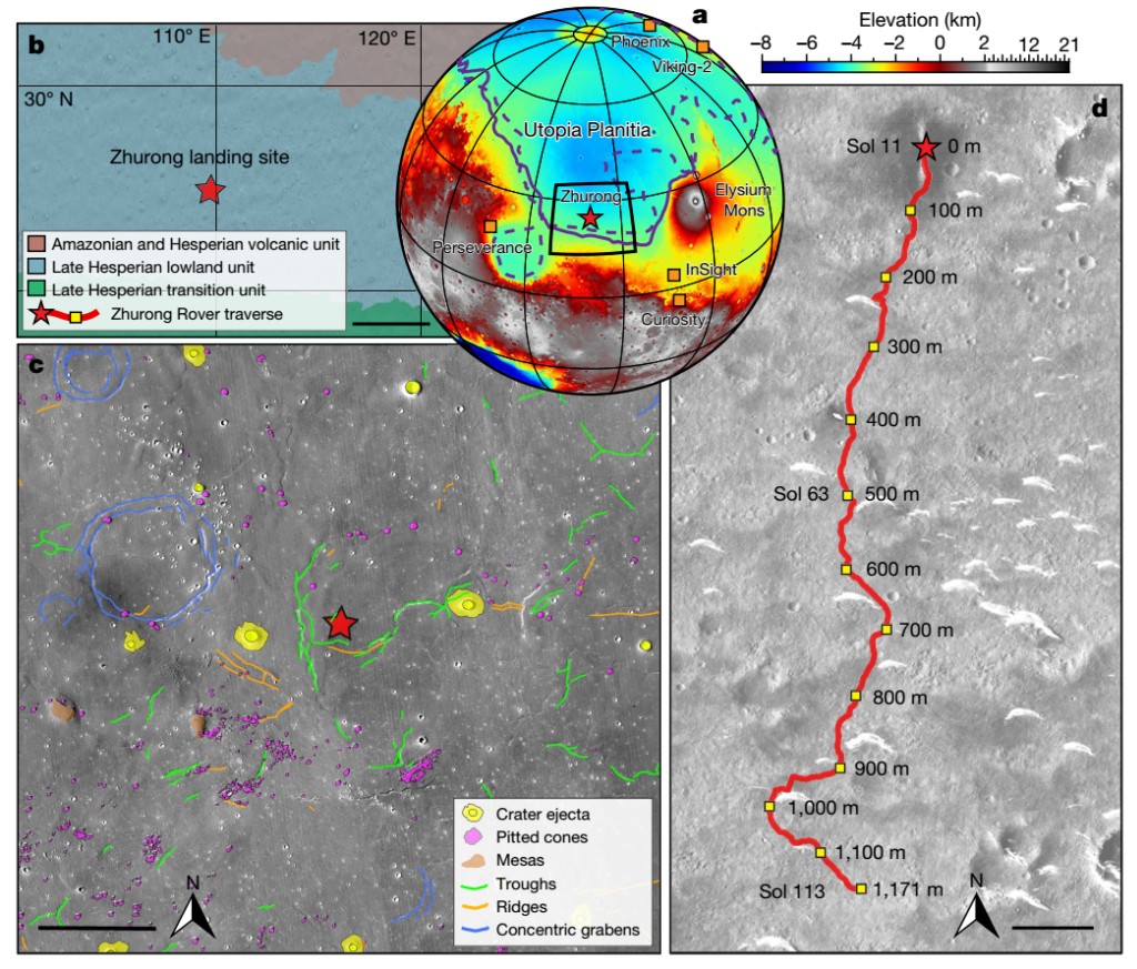 圖1 祝融著陸區(qū)地質(zhì)地貌圖。(a)祝融號、鳳凰號、洞察號、好奇號、毅力號和海盜號著陸點位置及古海岸線位置;(b)祝融號著陸點附近的簡化地質(zhì)圖,比例尺為200千米;(c)祝融號著陸點附近的地形地貌圖,比例尺為15千米;(d)祝融號行駛路徑圖,比例尺為100米