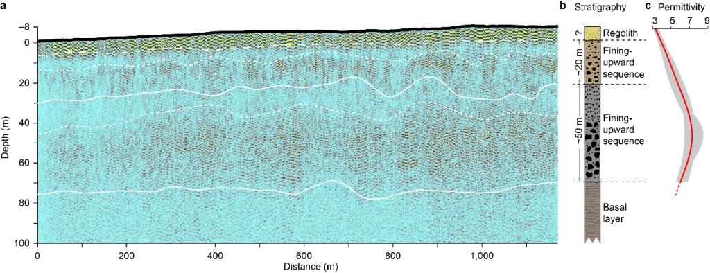 (2)深度在10-30米的第二層沉積序列,可能是著陸區(qū)中晚亞馬遜紀(jì)火表改造事件的結(jié)果。短時洪水、長期風(fēng)化或重復(fù)隕石撞擊作用可能形成了這一層中向上變細(xì)的沉積層序(圖3b)。