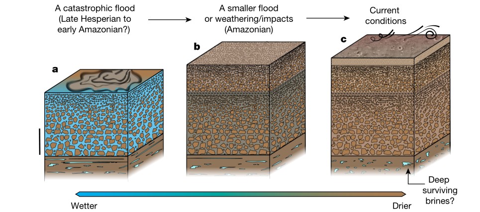 (3)深度范圍在30-80米的第三層沉積序列,可能反映著陸區(qū)更古老、更大規(guī)模的火表改造事件;谧矒艨佣杲Y(jié)果,估計這次改造事件可能發(fā)生在35-32億年前的晚西方紀(jì)到早亞馬遜紀(jì),可能與烏托邦平原南部的大型洪水活動有關(guān)(圖3a)。