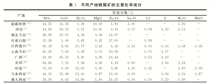 銅尾礦的化學(xué)組成非常復(fù)雜,不同產(chǎn)地的銅尾礦之間可比較性差,這是銅礦石成礦地質(zhì)、礦石開(kāi)采方法、選礦工藝以及銅尾礦堆存方式等差異所致。組成銅尾礦的主要元素有 Mg、Al、Si、S、Ca、Fe、Cu 等,且 伴 有 Mn、Ti、Zn、Sr等 微 量 元素。不同產(chǎn)地銅尾礦的主要化學(xué)成分見(jiàn)表1。