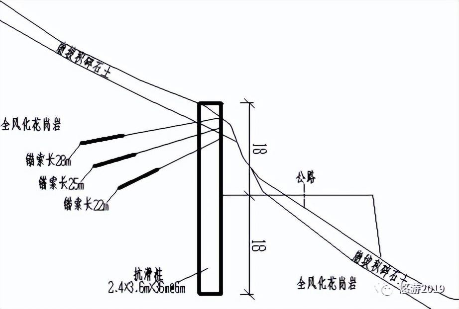 某二級公路某段坡體上部為厚約3.0m的崩坡積碎石土層,下部為深厚、呈巖芯呈柱狀的全風(fēng)化花崗巖。由于多種因素限制,路基邊坡不能放坡設(shè)置,而需采用路塹樁板墻進行支擋設(shè)置。技術(shù)人員在對樁后土壓力核查后認為,控制性的土壓力達1476KN/m,故在坡腳設(shè)置2.4×3.6m×36m@6m的樁板墻(其中樁體懸臂長18.0m),并在懸臂段設(shè)置3孔由6根組成的錨索形成錨索抗滑樁進行支擋。