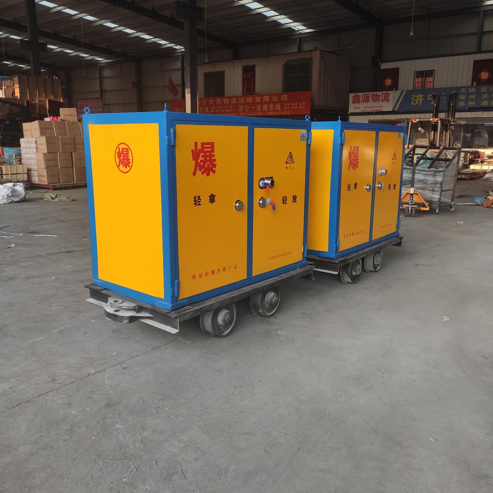 我公司生產(chǎn)的井下軌道火工品運(yùn)輸?shù)挠熊壥秸ㄋ庍\(yùn)輸車、軌道炸藥箱、礦車?yán)坠芟洌靡苿?dòng)式炸藥柜(需持有移動(dòng)式爆炸危險(xiǎn)品存放箱和防靜電報(bào)告)和礦車(煤安證或者礦安證)相結(jié)合,即符合炸藥等危險(xiǎn)品的運(yùn)輸存儲(chǔ)要求又符合井下軌道的運(yùn)輸(礦車),可根據(jù)用戶存儲(chǔ)數(shù)量定制尺寸。