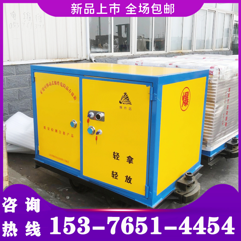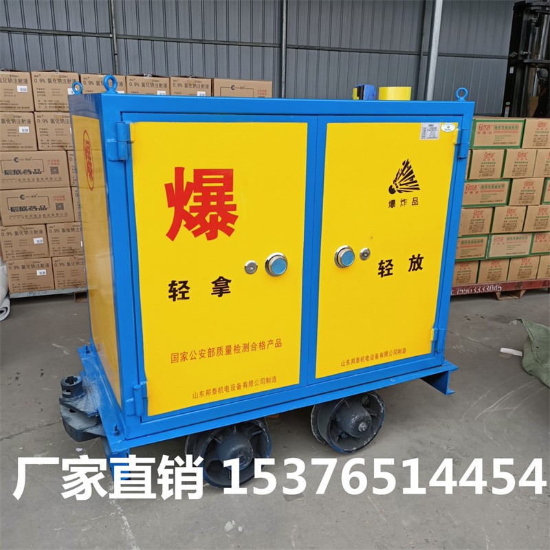 礦用可移動式爆炸危險品運輸箱也叫礦車炸藥箱、移動式危險品運輸車、礦用爆破器材軌道車、礦車運送炸藥安全箱、礦用井下物品運輸車、礦用爆炸危險品運輸車、軌道式雷管運輸車等名稱,通過礦山鋪設的軌道來進行運送炸藥和雷管。