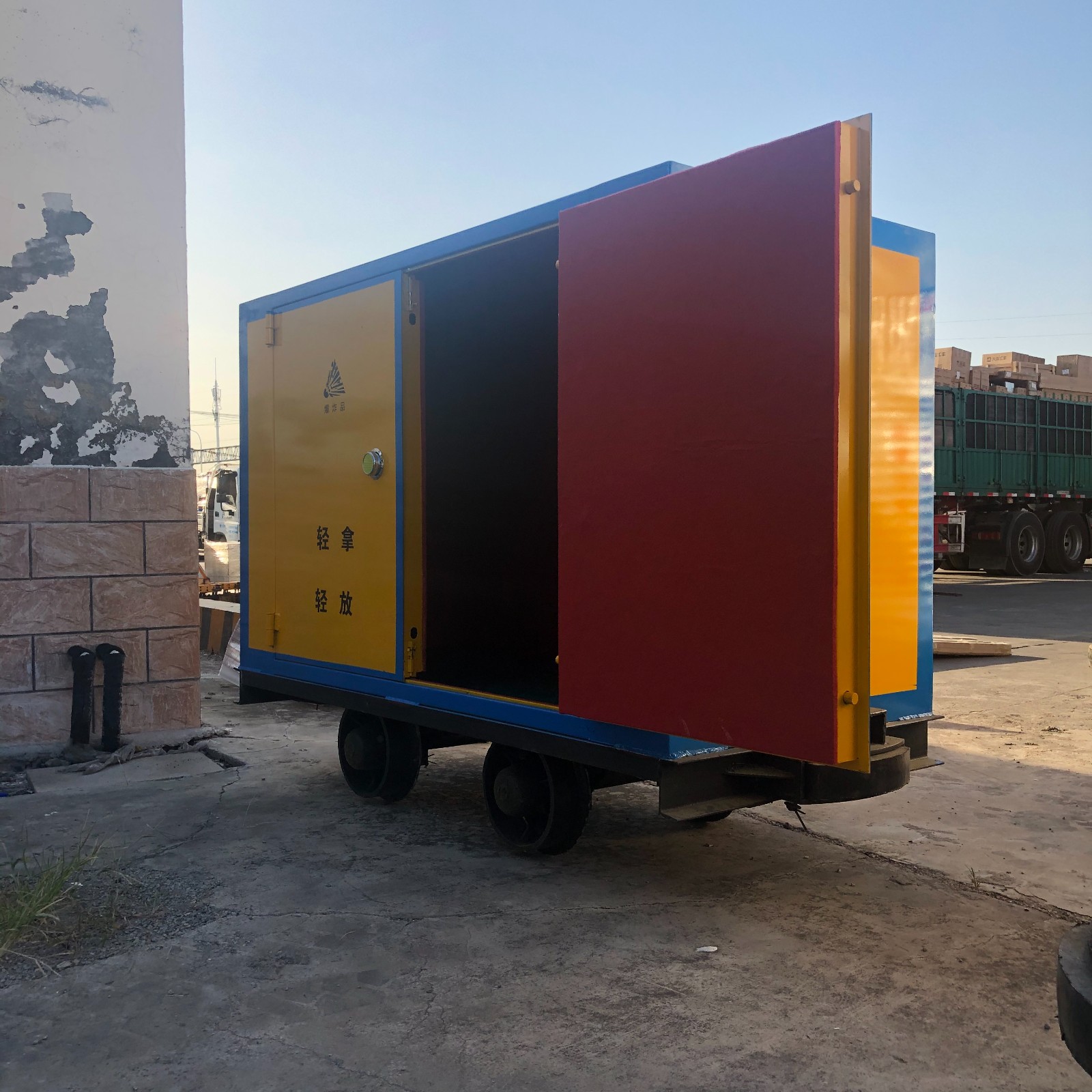 礦用軌道炸藥運(yùn)輸車(chē),主要的構(gòu)成部分是:上部分是可以根據(jù)存放量來(lái)定制大小的防爆炸藥柜,除了考慮到存放量,井下的罐籠大小以及巷道的限寬和限高也是需要注意的。它是采用6-8mm(厚度)規(guī)格的鋼板制作而成,內(nèi)部帶有防潮木板和抗震防靜電氈墊,下半部分是井下軌道行駛的材料車(chē)部分,材料車(chē)主要是由輪對(duì)和平板構(gòu)成,將炸藥柜焊接在平板上,通過(guò)緊密焊接。連體而成為一個(gè)整體井下炸藥運(yùn)輸車(chē)。