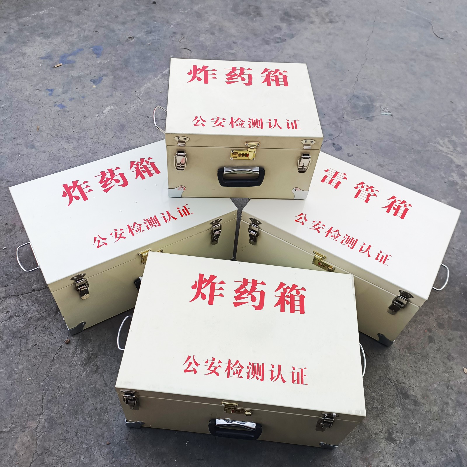 爆破施工專用危險品箱,是一種便于攜帶的炸藥,雷管等危險品的箱體,由于存放的介質(zhì)特殊性,所以材質(zhì)要求嚴(yán)格,箱體集堅固,防磕碰,防靜電以及防潮等特點,外層是由1mm厚淬火加工的防爆鋼板,內(nèi)置約7mm厚的防靜電木板,最里層整鋪防靜電阻燃?xì)。箱底部四角帶有不銹鋼防撞包邊,箱體釘有提手便于攜帶,也可安裝背帶用于斜跨,翻蓋設(shè)計便于存取,鎖具配有一個三位密碼鎖和兩個不銹鋼搭扣,可自配掛鎖。