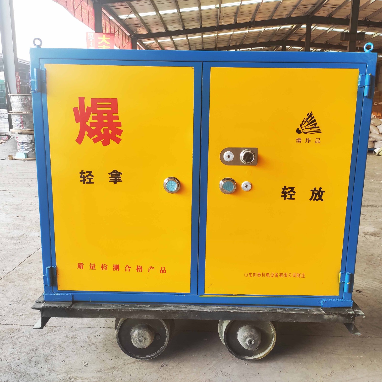 其次,材質(zhì)也需符合運輸危險品的使用要求,門板厚度不低于6mm厚,內(nèi)置10mm厚絕緣木板,最里層需整鋪防靜電阻燃氈;符合國家要求雙鎖配置,由兩人分開保管,也可加配一個密碼鎖(由于礦井內(nèi)光線較差,密碼鎖開鎖比較麻煩,也可選擇不裝),柜體要求焊接處嚴密結(jié)實,有防水防靜電功能。用于承載運輸柜的礦車軌距可根據(jù)礦井常用軌道,定制600/762/900軌距。