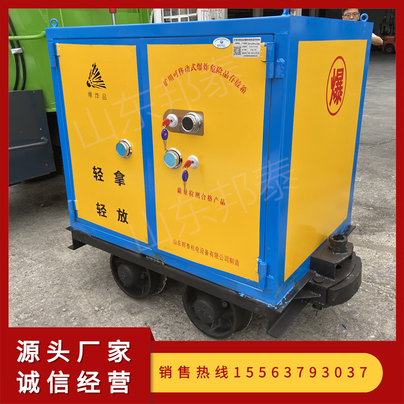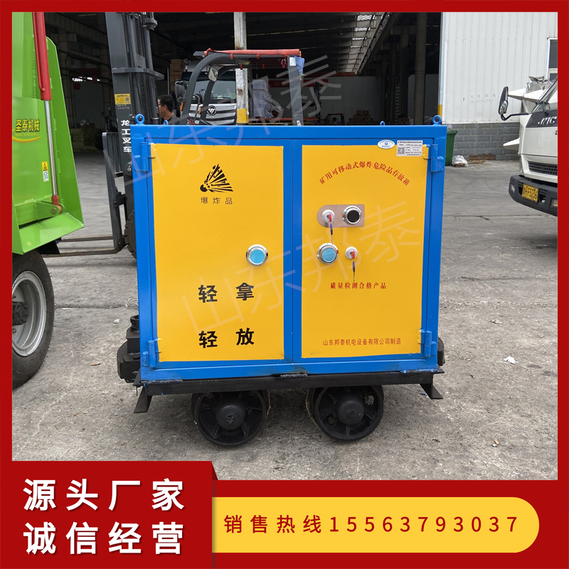 山東邦泰生產的井下民爆物品運輸車,是礦山軌道井下運輸民爆品的工具,因每個礦山炸藥運輸量不同,因此可以根據運輸的炸藥數量定制尺寸,比如礦山用的炸藥箱尺寸為320*300*300,如果裝20件500公斤左右,就跟據這個尺寸和礦山罐籠、巷道尺寸,確定井下民爆炸藥運輸車的外形尺寸,確?梢栽诰逻\輸自如,可在軌道的任何貨物?奎c?咳∝。