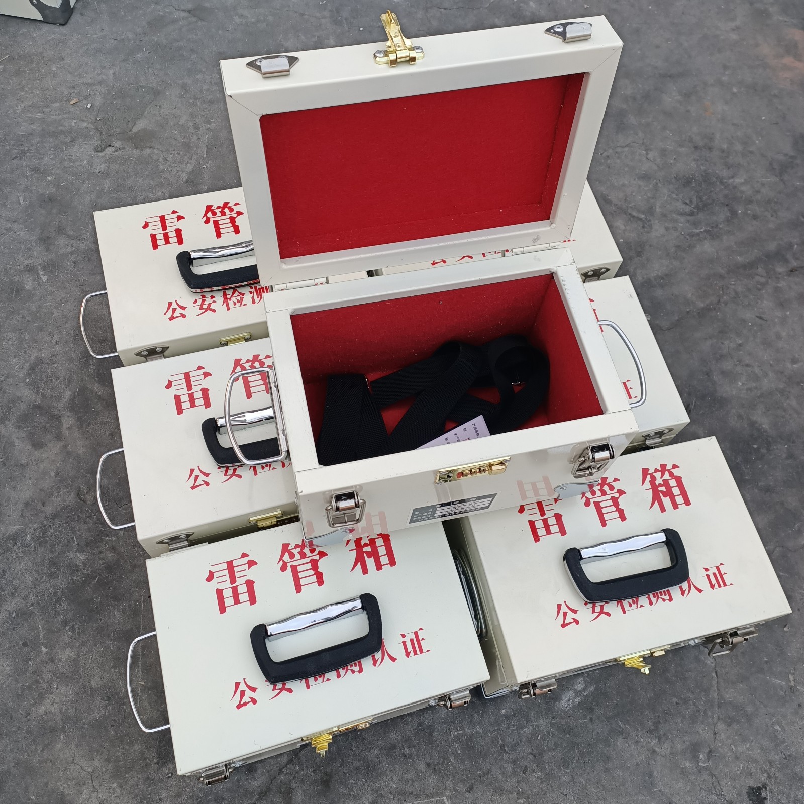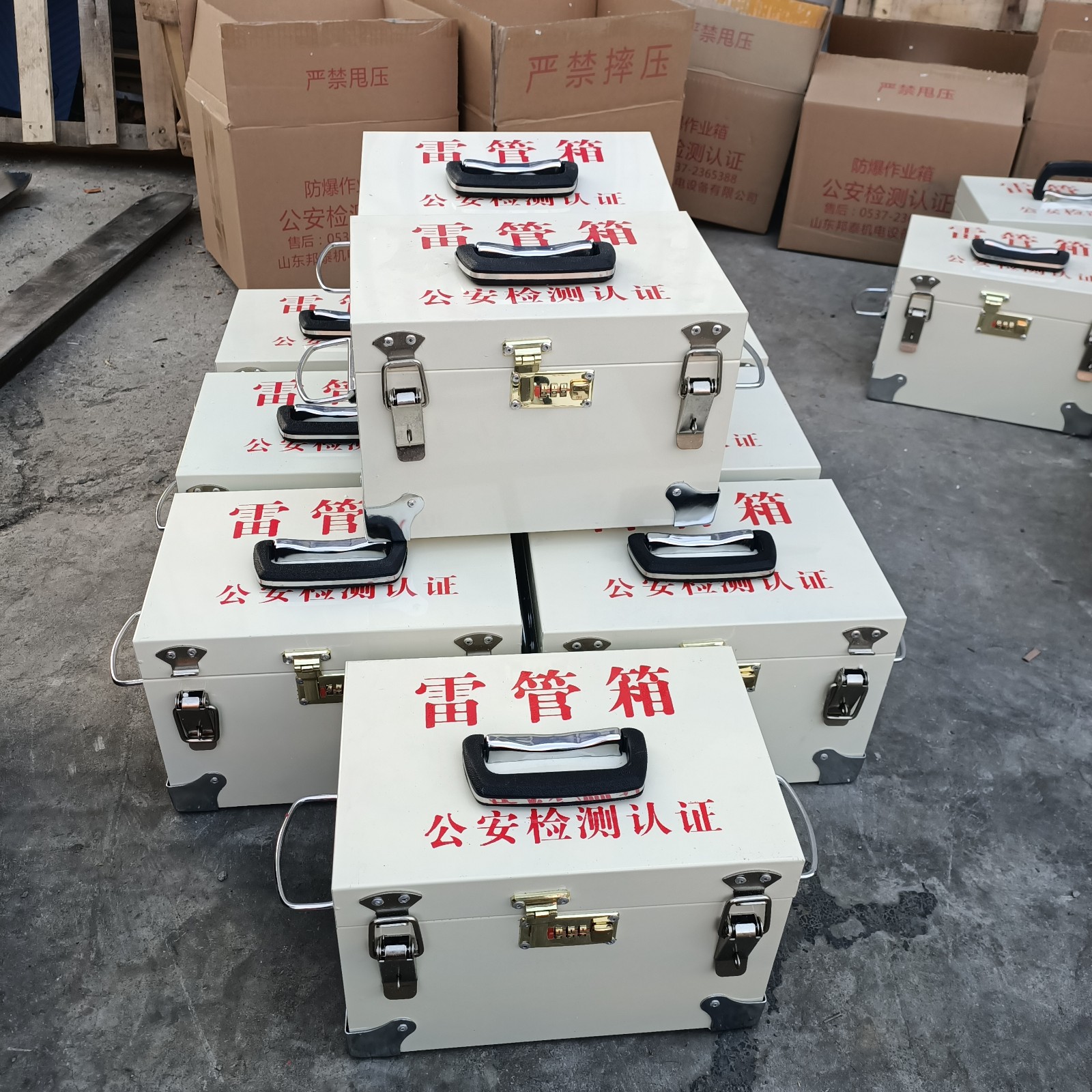 金屬鋼板材質(zhì)爆破器材箱體外層是1mm厚鋼板,內(nèi)置7mm絕緣木板,最里層是約2mm厚抗震防靜電氈墊。防爆箱鎖具配有三位防盜密碼鎖與兩個(gè)不銹鋼鎖扣,是標(biāo)準(zhǔn)雙鎖配置,符合公安檢測(cè)標(biāo)準(zhǔn)。箱體四角嵌有不銹鋼防撞包角,確保箱體更加堅(jiān)固、抗撞擊,不易變形。箱體配有提手并加裝聚氨酯背帶,爆破作業(yè)員可手提或者斜跨,運(yùn)輸方便。