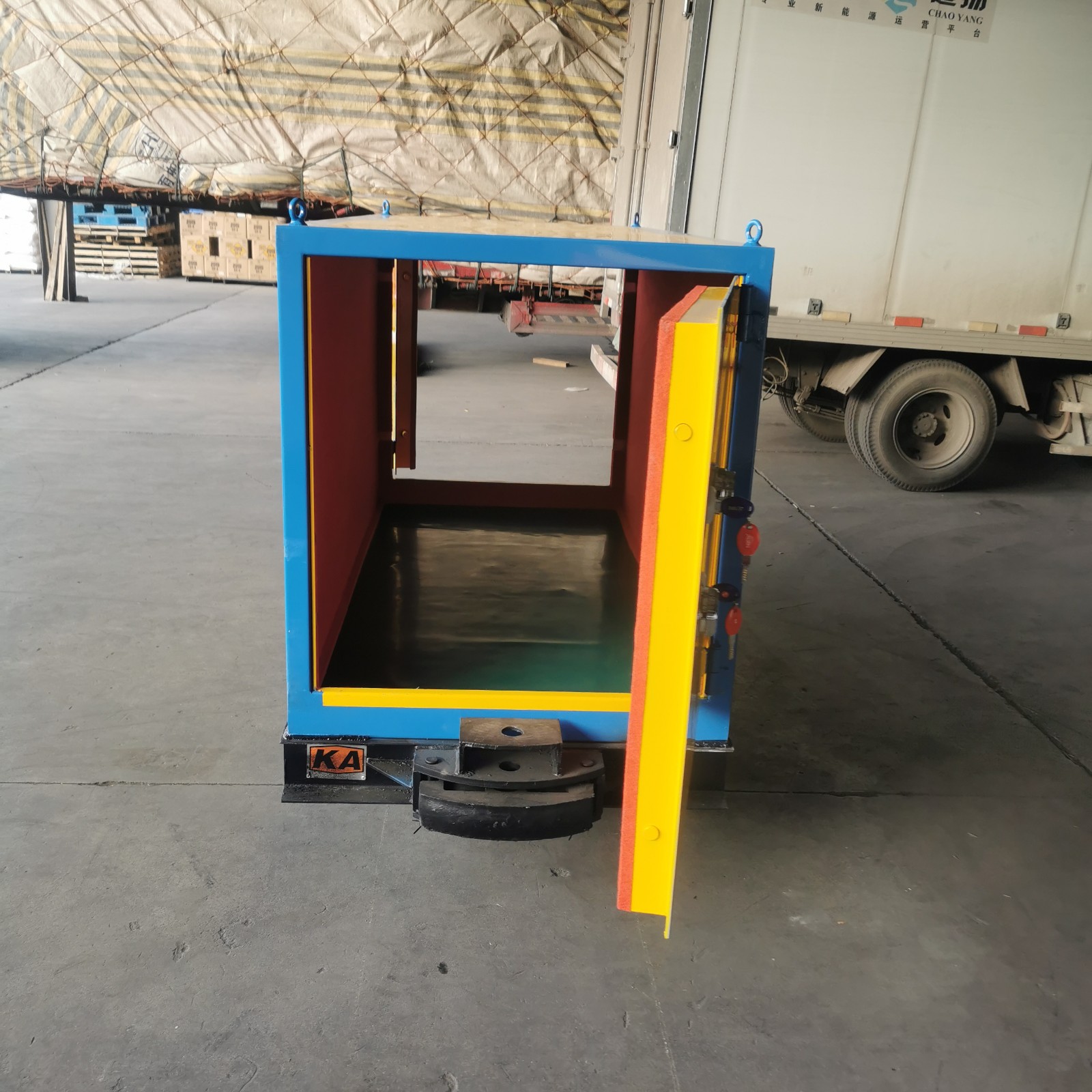 礦車炸藥車由儲存柜體和材料車底盤一起組成,柜體是選用的6mm厚度的防爆鋼板,內(nèi)層材質(zhì)是絕緣木板和抗靜電阻燃氈墊,在門扇上裝有一個密碼鎖和兩把鑰匙鎖,安全性高,第二部分為材料車載體,根據(jù)礦井常用的軌距,可定制600mm,762mm,900mm幾種軌距,存放量的多少,決定著運輸車的具體尺寸,按需定制。