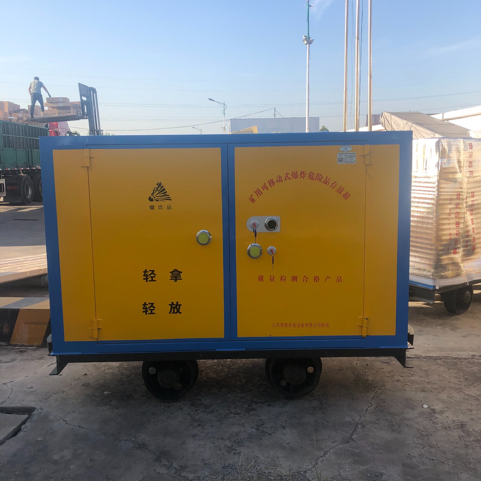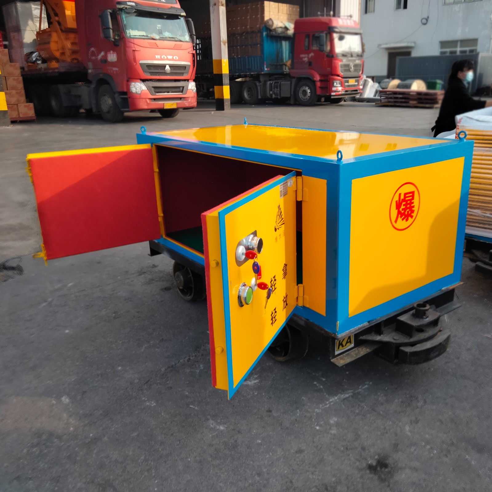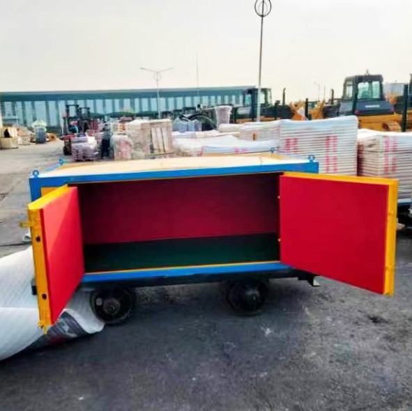 在礦井內(nèi)部運(yùn)輸爆炸危險(xiǎn)品時(shí),安全性是首要考慮的因素,使用普通礦車來運(yùn)輸肯定是不行的,安全性低不符合存放爆炸危險(xiǎn)品的需求,根據(jù)實(shí)際情況,可選擇爆炸危險(xiǎn)品專用運(yùn)輸車,這種運(yùn)輸車與礦車的主要區(qū)別在于它的存放柜體體是符合爆炸危險(xiǎn)品的條件,柜體采用具有防爆特性的金屬鋼板材質(zhì)焊接成型,鋼板厚度為6mm,并在柜體內(nèi)部6面都鋪設(shè)有絕緣木襯板和防靜電阻燃?xì)謮|,有效阻絕產(chǎn)生靜電危害,門扇的鎖具采用雙鎖裝置,避免非專職人員隨意存取危險(xiǎn)物品,造成不良后果。