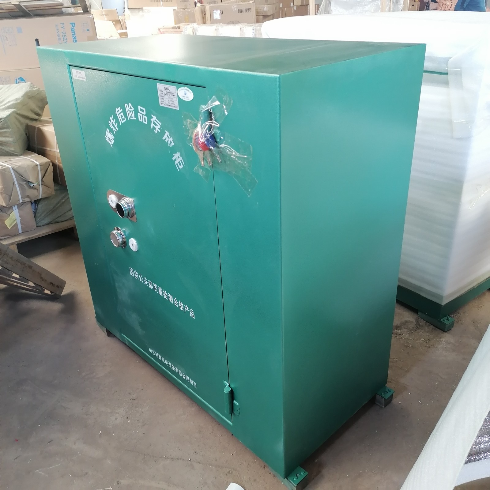 邦泰廠家根據(jù)多年的防爆存放箱生產(chǎn)經(jīng)驗(yàn),開發(fā)生產(chǎn)的火工品防爆柜,采用冷軋鋼板材質(zhì)制成,冷軋鋼板具有較高的強(qiáng)度和耐腐蝕性能,是一種常用的防爆柜材料,門板處鋼板厚度可達(dá)6mm厚,具有防爆,防撞擊的優(yōu)勢(shì),柜門配備專用的防盜鎖具(由一套防盜密碼鎖和兩把鑰匙鎖組成),能夠有效地防止柜門被非法打開。