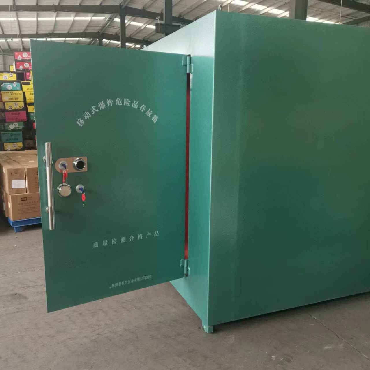 邦泰廠家根據(jù)多年的防爆存放箱生產(chǎn)經(jīng)驗(yàn),開(kāi)發(fā)生產(chǎn)的火工品防爆柜,采用冷軋鋼板材質(zhì)制成,冷軋鋼板具有較高的強(qiáng)度和耐腐蝕性能,是一種常用的防爆柜材料,門(mén)板處鋼板厚度可達(dá)6mm厚,具有防爆,防撞擊的優(yōu)勢(shì),柜門(mén)配備專(zhuān)用的防盜鎖具(由一套防盜密碼鎖和兩把鑰匙鎖組成),能夠有效地防止柜門(mén)被非法打開(kāi)。