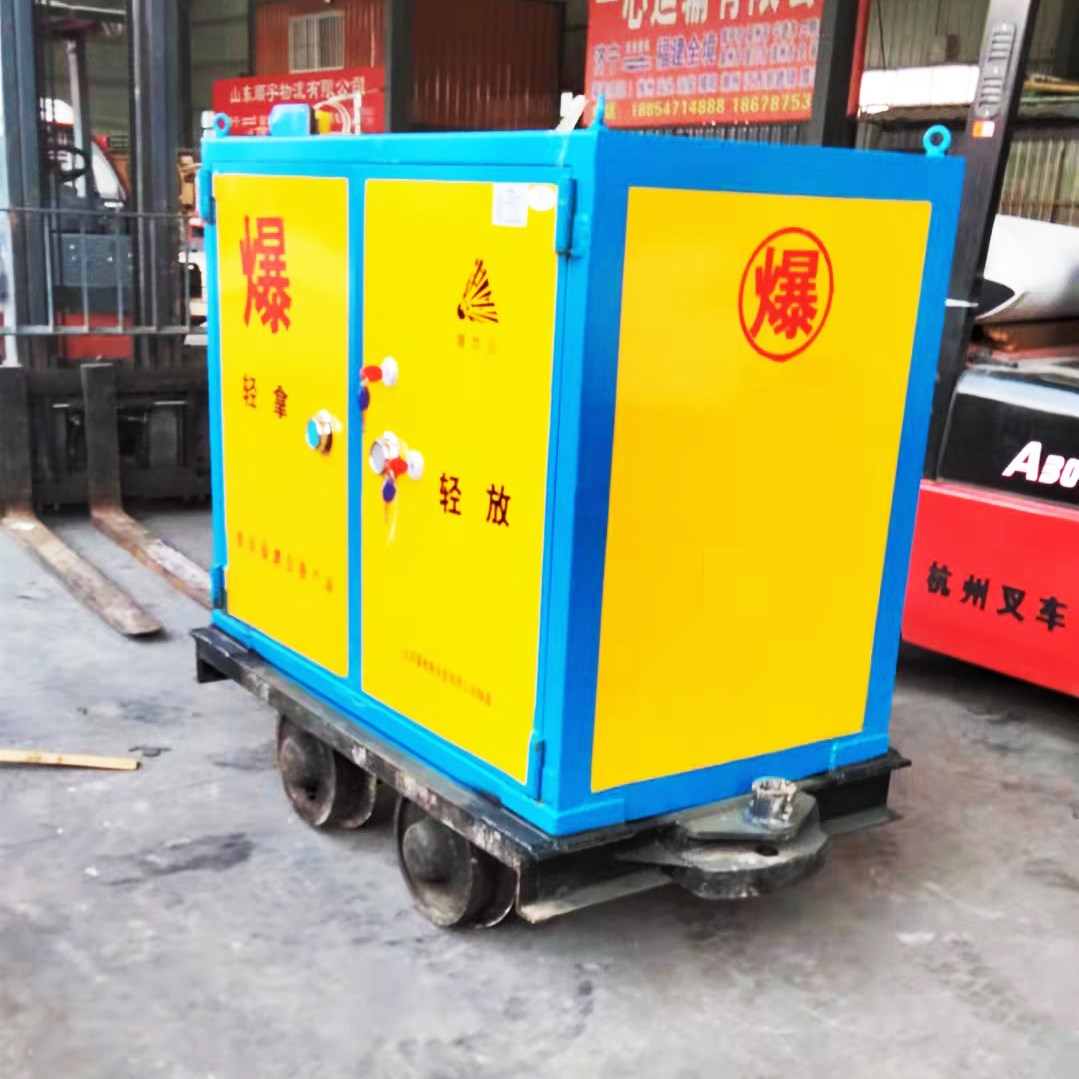 運輸車由礦對輪和存放柜兩部分構(gòu)成,軌距根據(jù)礦山實際軌距選擇,存放柜體具有防爆,防靜電的作用,材質(zhì)為鋼板焊接而成,鋼板厚度約為6-8mm,鋼板內(nèi)部是絕緣木板和防靜電阻燃?xì)謮|,氈墊鋪滿柜體內(nèi)壁,也會起到防震的作用。存放柜體經(jīng)專業(yè)檢測部門檢測,取得了公安檢測報告,防爆檢測報告 ,防靜電檢測報告,為礦山施工帶來安全保障。