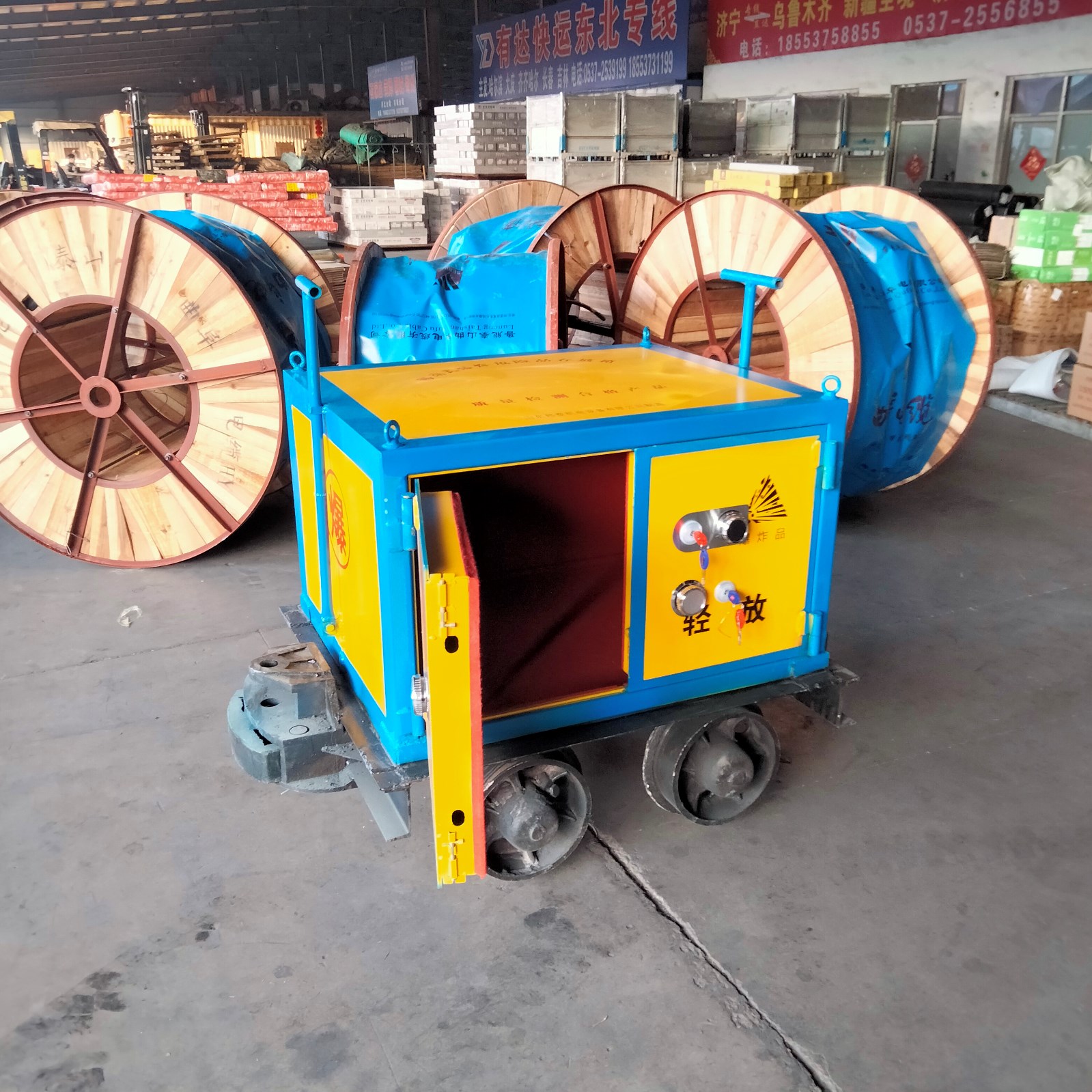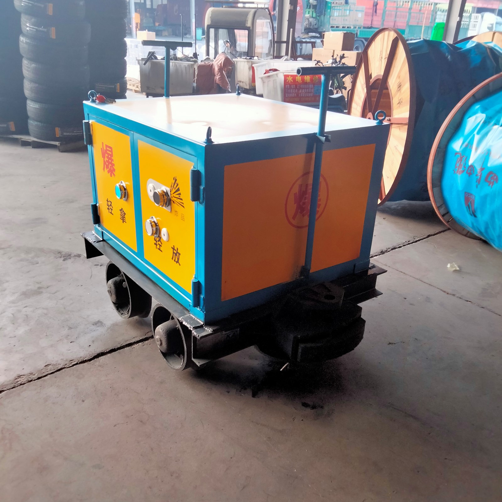 該運輸車符合礦山類機械的安全標識和檢測資質(zhì),帶有”KA”或者“MA”標識,車體由兩部分焊接而成,上部分為存放載體,為鋼制結(jié)構(gòu),由不低于6mm厚的鋼板焊接而成,內(nèi)部材質(zhì)為絕緣木板和絕緣阻燃氈墊,下部分為礦對輪用來承載上面的存放柜,根據(jù)礦山常用軌距,可定制600/762/900mm軌距,門板鎖具,國標要求配備雙鎖,鑰匙由兩人分開保管,保障存放安全性。
