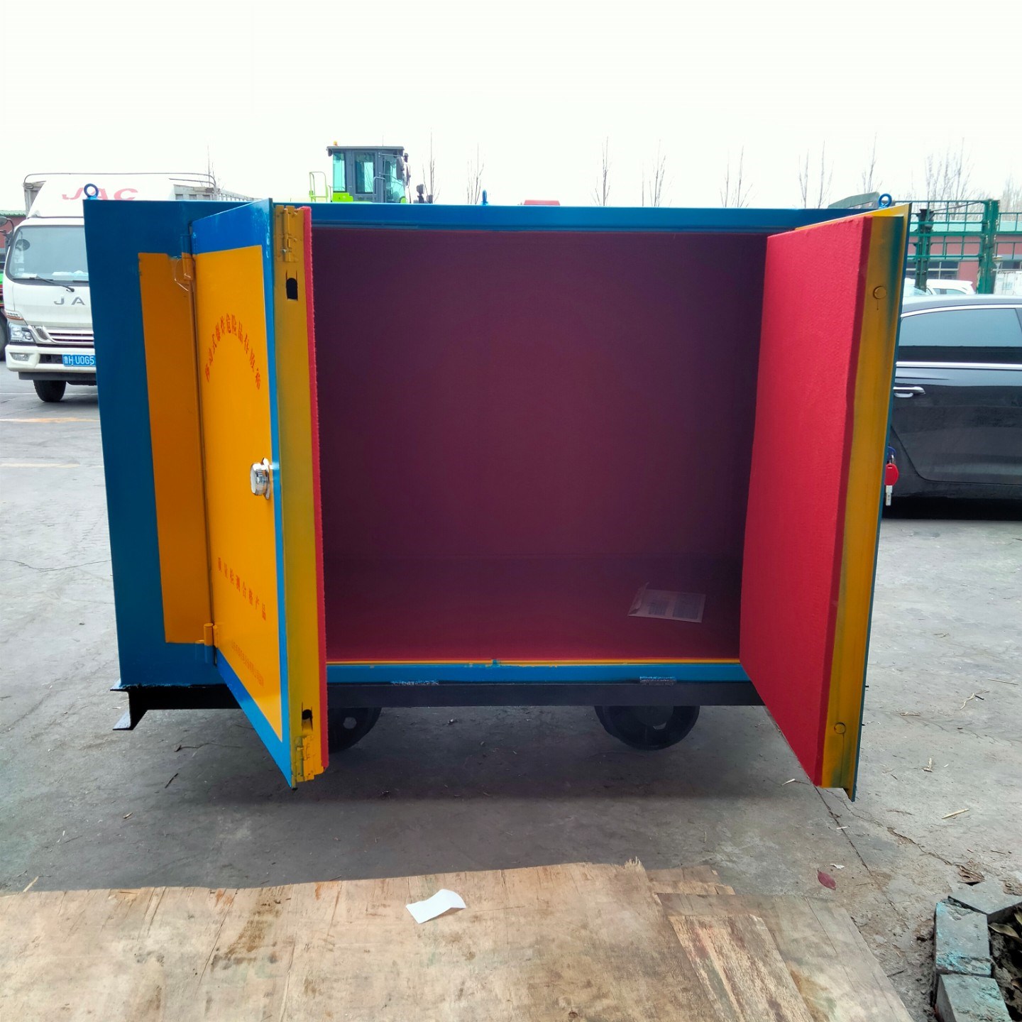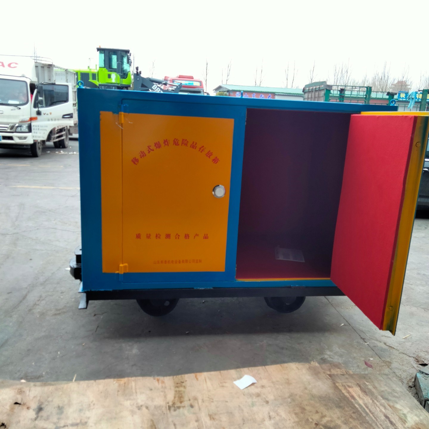 火工品運輸車屬于特種產(chǎn)品運輸車輛,一旦發(fā)生危險帶來的后果是非常嚴重的,所以,對運輸車的材質(zhì)要求是嚴格的,這款有軌式運輸車是采用優(yōu)質(zhì)鋼板材質(zhì)焊接成型的,存放柜體鋼板厚度不低于6mm厚,內(nèi)部有絕緣木板和防靜電處理的氈墊,在防盜性能上也是做了用心的設(shè)計,門扇裝有一個機械密碼鎖和兩把十字鎖具,鑰匙由爆破人員分開管理以避免造成丟失的情況。