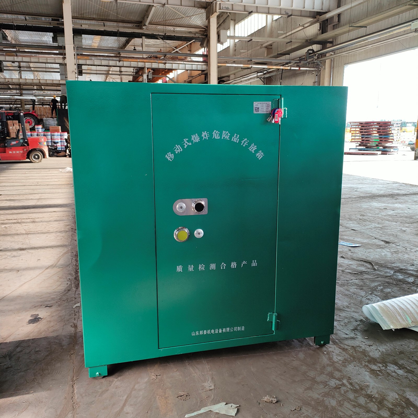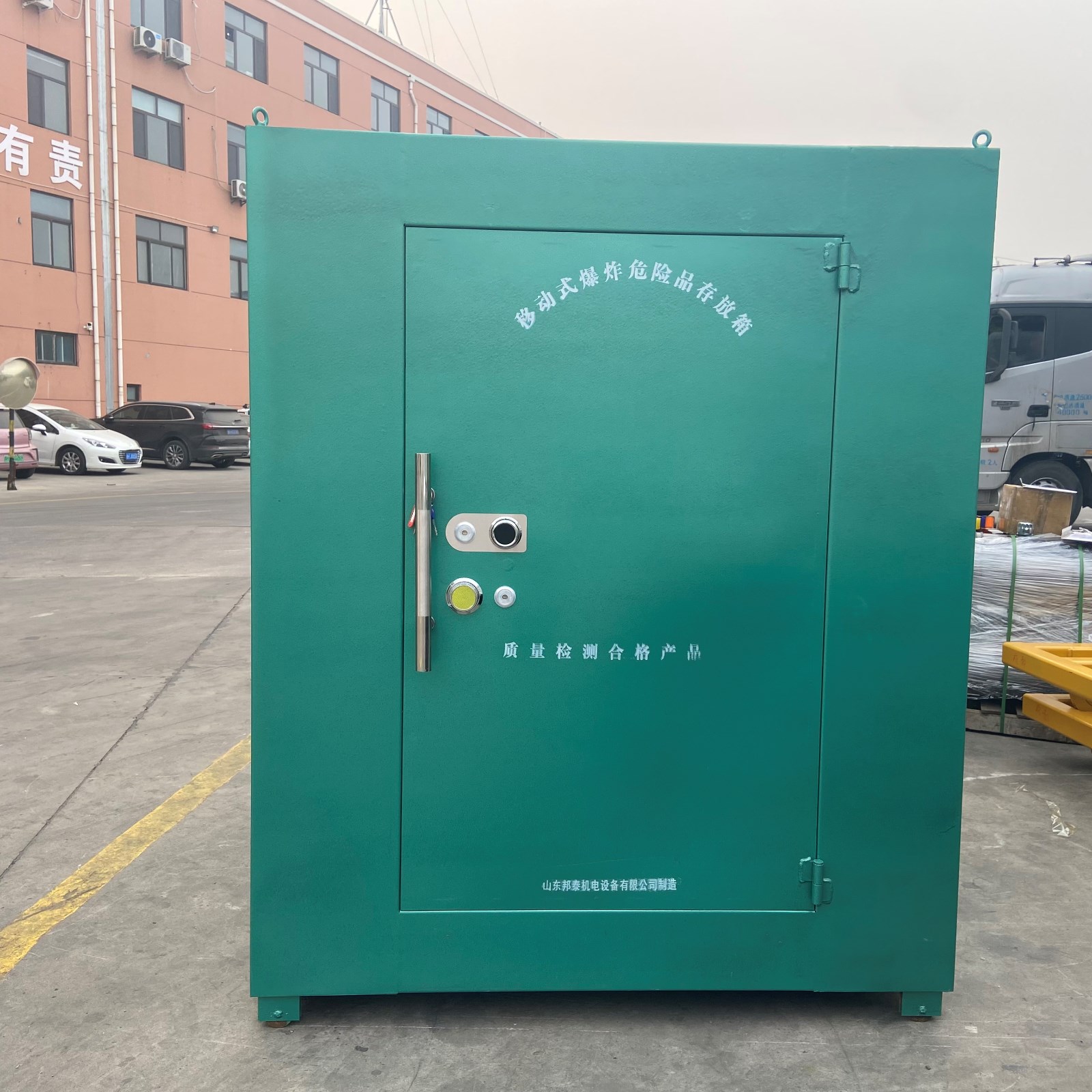 爆破器材臨時存放柜,適用于施工點距離爆破器材存放庫距離較遠的情況下,不能隨時從庫房里領取爆破器材,所以在施工點附近做臨時存放和運輸?shù)囊豢顚S么娣殴瘛4娣殴竦撞堪惭b有四個行走輪,可在平地上進行短距離移動,也可以放置在運輸車斗內(nèi)進行運輸。