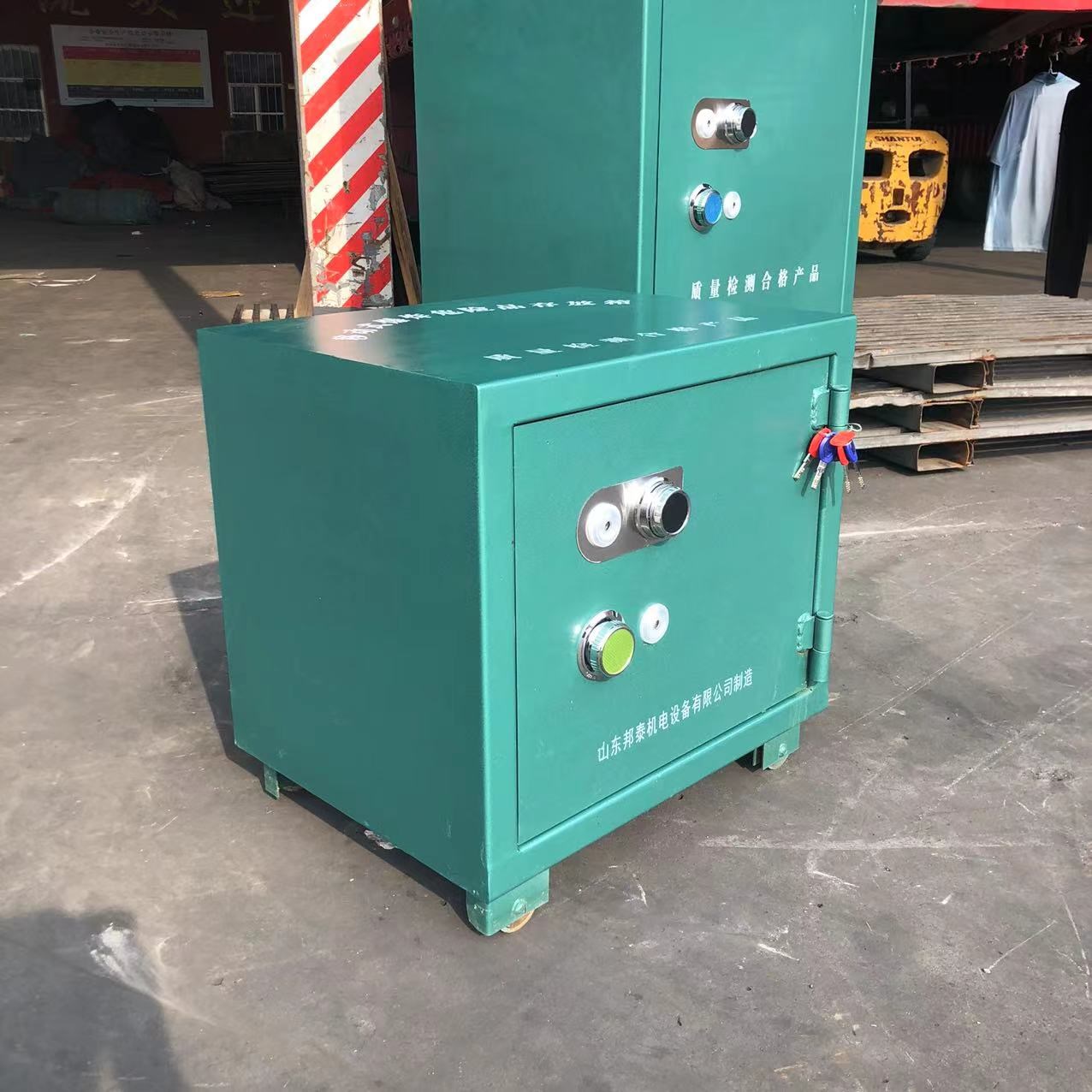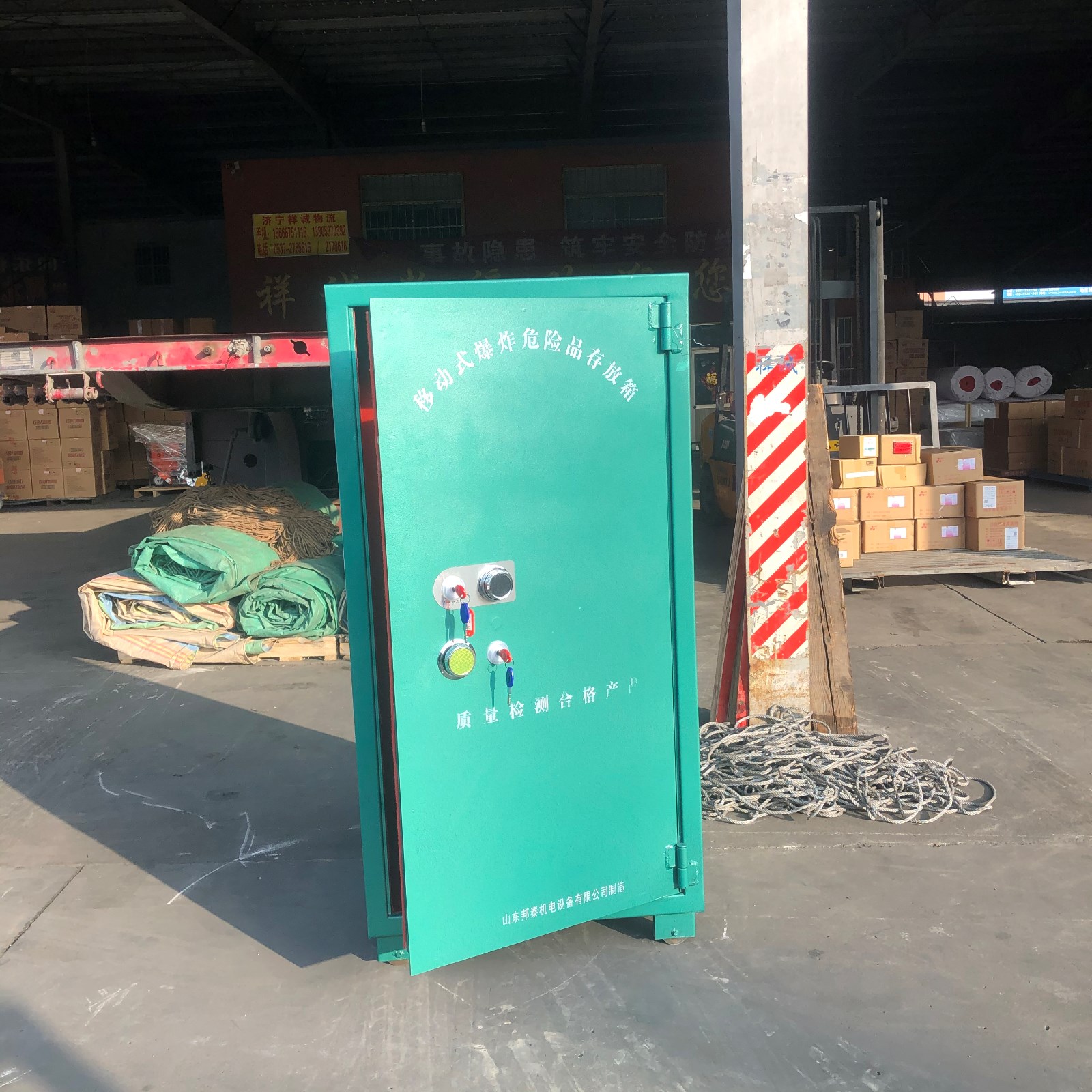 BTJD-001可移動(dòng)式爆破器材存放柜,用于儲(chǔ)存具有易燃易爆性質(zhì)的危險(xiǎn)品,常用于礦山開采,隧道工程,鐵路建設(shè)等需要涉及到爆破施工的場(chǎng)所,用來防護(hù)爆破物品存放的安全,采用了加厚鋼板材質(zhì)制作而成的柜體能夠有效抵御外部的沖擊和撞擊,這種材質(zhì)的柜體堅(jiān)固耐用,使得在存放過程中更加安全可靠,除了加厚鋼板材質(zhì)的柜體,這款可移動(dòng)式炸藥存放柜還采用了多種防護(hù)措施來確保炸存放的安全:柜門配備了堅(jiān)固的雙鎖裝置,配有一套密碼鎖和十字鑰匙鎖,這款存放柜還采用了四輪移動(dòng)裝置,可以輕松地在工作場(chǎng)所內(nèi)進(jìn)行移動(dòng),不僅如此,柜體頂部還可加裝吊環(huán),便于起吊運(yùn)輸。