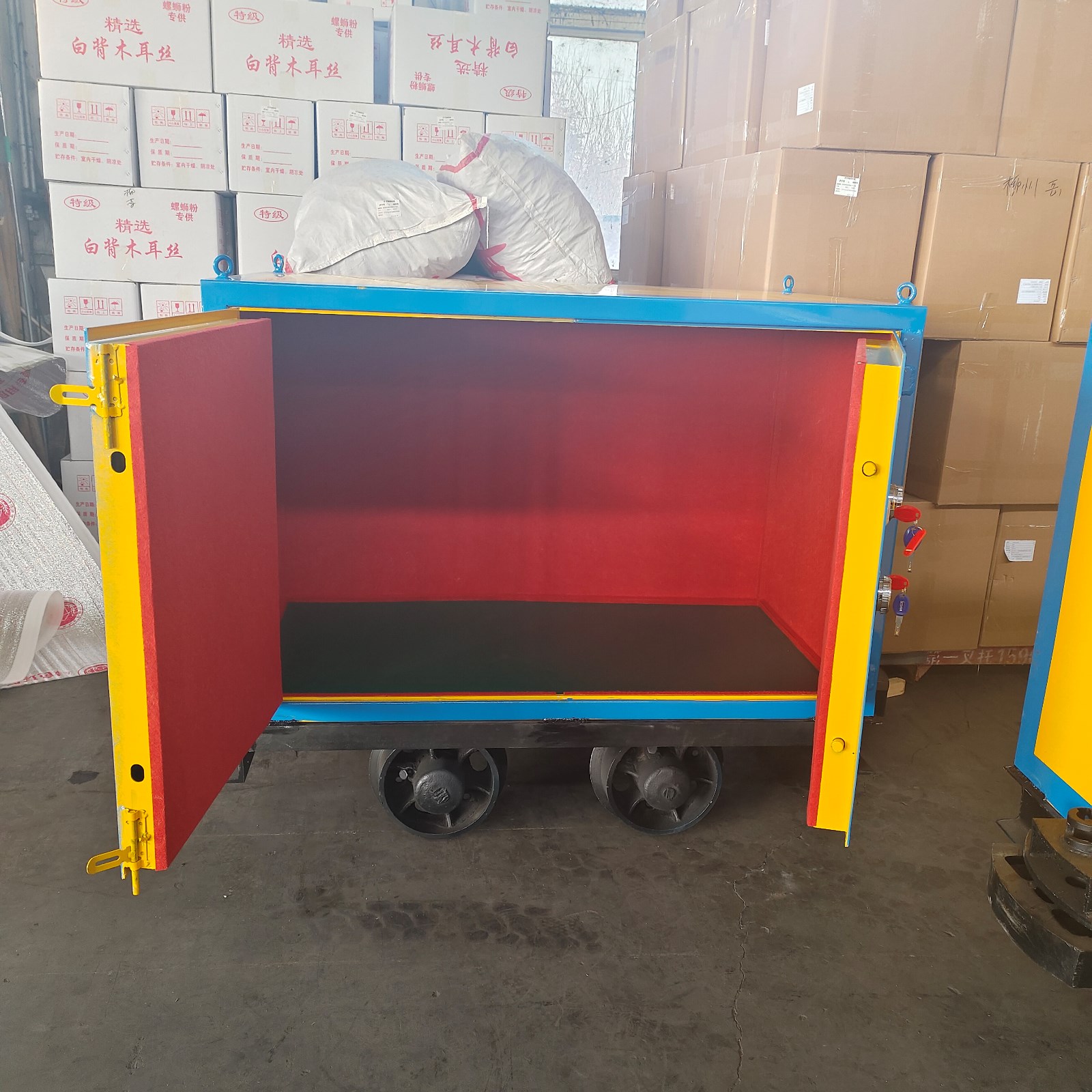 其次,我們的有軌式炸藥運(yùn)輸車采用了堅固的鋼板材質(zhì)制成,堅固耐用,焊接處平整結(jié)實(shí),在存放柜體內(nèi)部做防靜電處理,底部鋪設(shè)一層防靜電軟墊,能夠有效減震,保護(hù)炸藥運(yùn)輸過程中的安全。在礦井工作環(huán)境中,地面的坑洼和顛簸是不可避免的,缺乏良好的減震效果可能對內(nèi)部運(yùn)輸物品造成損壞,所以在柜體內(nèi)部做減震處理,能夠確保炸藥在運(yùn)輸過程中的安全性。