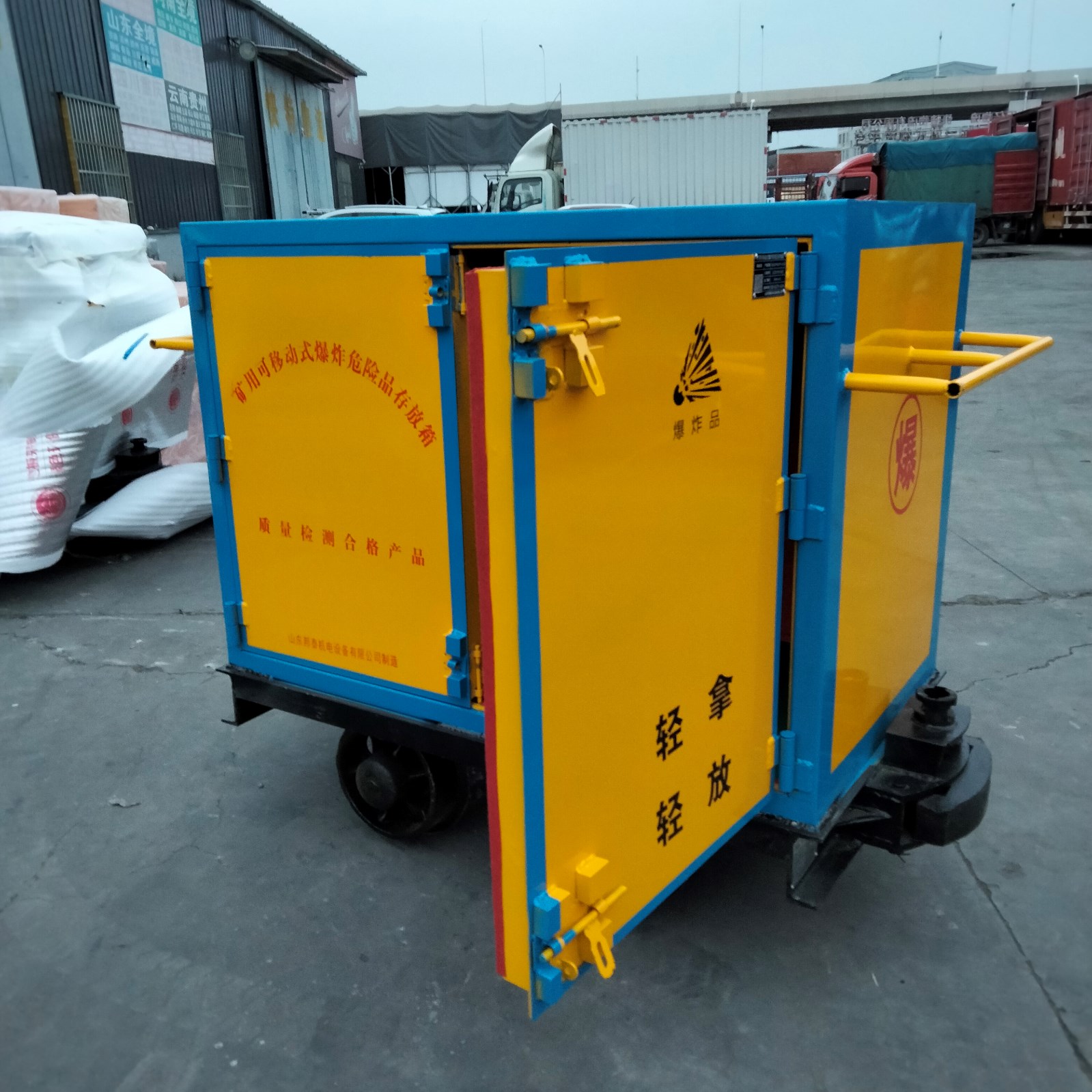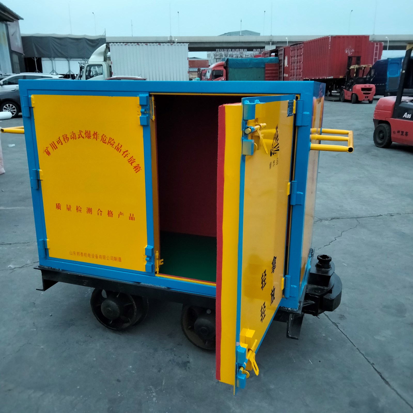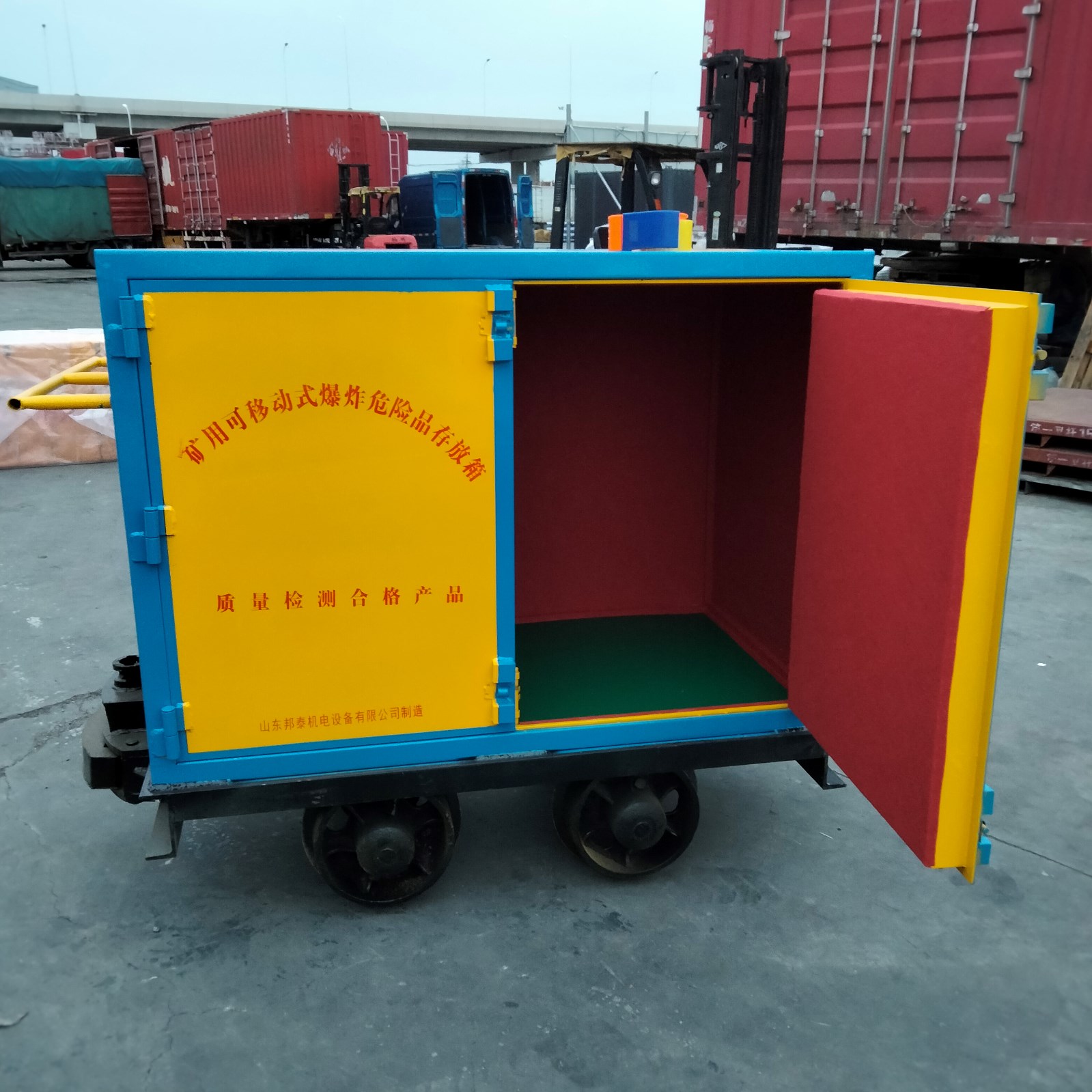車體分為上下兩個部分,上部分為存放載體,用于儲存火工危險品,下部分為運輸載體,用于軌道上行駛運輸。火工品存放柜必須符合防爆,防靜電的要求,材質(zhì)為冷軋鋼板焊接而成,鋼板厚度為不低于6mm厚度,才符合防爆檢測資質(zhì),內(nèi)部為木板和防靜電氈墊材質(zhì),有效預(yù)防產(chǎn)生靜電的同時也起到防震作用。下部分的運輸載體即為礦車底盤,根據(jù)不用軌距,可定制600mm/762mm/900mm的軌距。