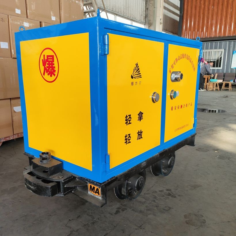在井內(nèi)礦車(列車)、汽車運(yùn)輸時,同樣需要遵守一系列規(guī)定。例如,交接班、人員上下井的時間內(nèi),嚴(yán)禁運(yùn)送爆炸材料。炸藥和電雷管不得在同一列車內(nèi)運(yùn)輸,且必須用空車隔開。列車的行駛速度也不得超過規(guī)定值,以確保運(yùn)輸過程中的安全。(齊魯邦泰BTJD-001礦用可移動式爆炸危險品存放箱)