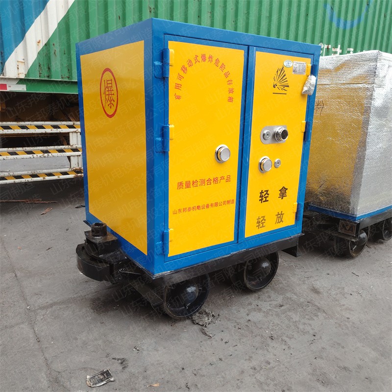 上半部分為外置6-8mm厚的防爆鋼板,內(nèi)置10mm厚的絕緣木板及2.0mm的防靜電膠墊和抗震阻燃氈組成的礦用可移動式爆炸危險品存放箱;下半部分為可供600軌距、762軌距、900軌距軌道使用的礦用材料車。