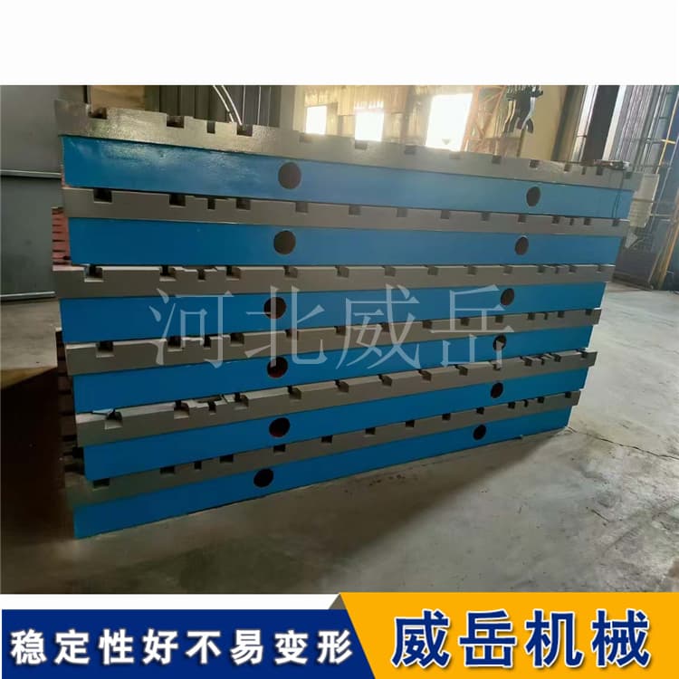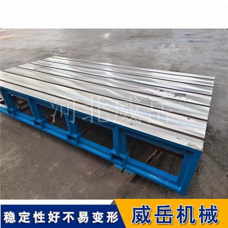 面設計(中間較周邊高0.01-0.03mm),補償焊接熱變形造成的工件下凹。防銹處理方面,靜電噴涂的鋅鎳合金涂層可耐受焊接飛濺物侵蝕,其耐鹽霧性能達到800小時以上,遠優(yōu)于傳統(tǒng)的防銹漆工藝。在動力機械焊接的特殊應用場景中,T型槽鑄鐵平臺展現(xiàn)出獨特優(yōu)勢。焊接船用柴油機曲軸箱體時,平臺的阻尼特性可吸收曲柄連桿機構產(chǎn)生的7-12Hz低頻振動;而機床導軌焊接時,平臺的導熱系數(shù)(54W/m·K)能快導出集中熱量,減少熱影響區(qū)變形。某渦輪增壓器制造商采用帶循環(huán)水冷的鑄鐵平臺,在焊接鎳基合金渦殼時,將基體溫度控制在80℃±5℃,顯著降低了高溫裂紋風險。對于工程機械的耐磨件堆焊,磁性T型槽平臺可固定磁性夾具,實現(xiàn)硬質合金焊條的自動送絲軌跡控制。