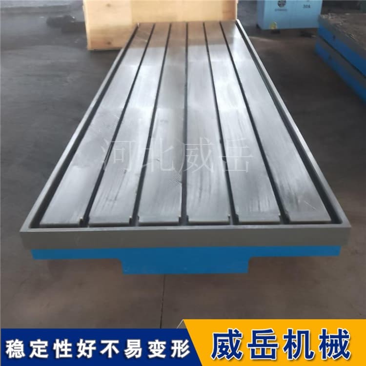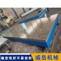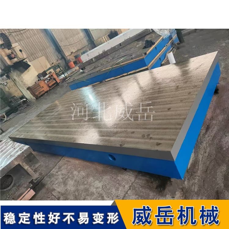 在結(jié)構(gòu)設(shè)計(jì)上,HT250鑄鐵T型槽平臺(tái)遵循“剛性優(yōu)先”原則。臺(tái)面厚度通常為平臺(tái)長(zhǎng)度的1/10-1/12,例如2米長(zhǎng)的平臺(tái),臺(tái)面厚度約200mm,以保證足夠的承載能力;底部采用網(wǎng)格狀加強(qiáng)筋布局,筋條寬度為臺(tái)面厚度的1/2-2/3,間距控制在300-500mm,既減輕整體重量,又能均勻分散應(yīng)力;T型槽的加工采用銑削工藝,槽寬精度控制在±0.1mm,槽深與槽間距根據(jù)國(guó)標(biāo)設(shè)計(jì),常見(jiàn)規(guī)格有14mm×9mm、18mm×11mm等,確保與T型螺栓適配。此外,為去掉鑄造內(nèi)應(yīng)力,HT250鑄鐵平臺(tái)需經(jīng)過(guò)6個(gè)月以上的自然時(shí)效或人工時(shí)效處理,避免后期使用中出現(xiàn)變形。