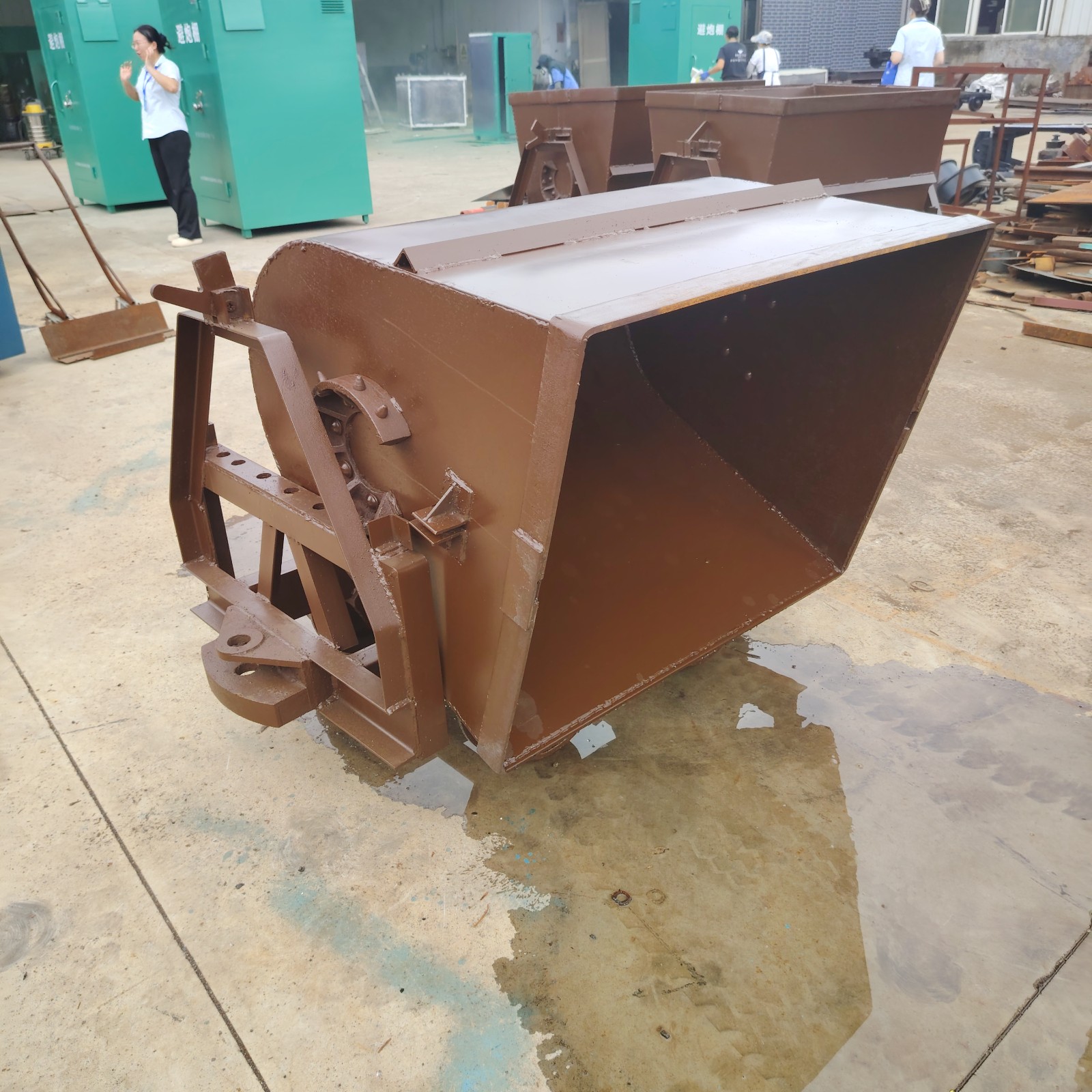 翻斗式礦車是一種礦車的自卸車形式,這種礦車自帶翻轉(zhuǎn)架,能對物料做到及時有效地翻轉(zhuǎn)。全車采用金屬結(jié)構(gòu),車箱斷面為V形或U形,支承在車架的翻轉(zhuǎn)軌上,車箱在翻轉(zhuǎn)軌上翻轉(zhuǎn)卸載。翻斗式礦車結(jié)構(gòu)簡單,堅固耐用,使用方便,只需人力打開止動板就能很容易地卸下物料。此外,翻斗式礦車相對來說自動化程度很高,輪軸采用了滾柱軸承,有效地減少了運行阻力,因此用機(jī)車或人力均能牽引或推動。翻斗式礦車不需用任何輔助設(shè)施,可左右自動翻轉(zhuǎn),使用靈活、輕便。