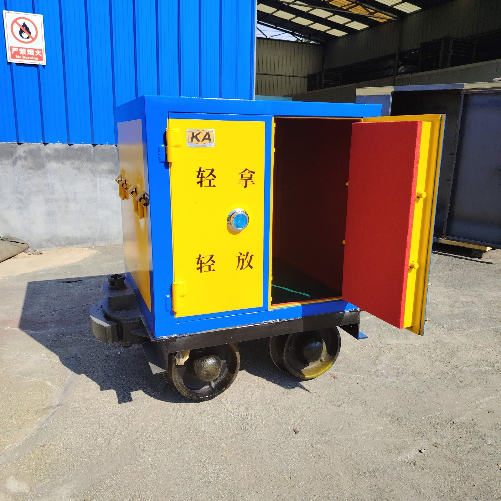 上半部分為外置6-8個(gè)厚的防爆鋼板,內(nèi)置10個(gè)厚的絕緣木板及2個(gè)厚的防火防震防靜電的阻燃?jí)|組成的礦用爆破箱;下半部分為可供600軌距、762軌距、900軌距軌道使用的材料車。