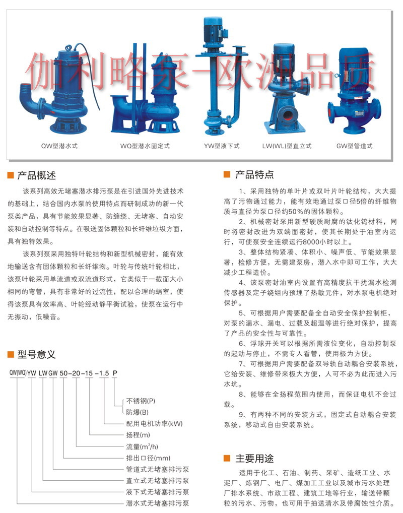 WQ系列無堵塞潛水排污泵適用用于工廠商業(yè)嚴(yán)重污染廢水的排放、主宅區(qū)的污水排污站、城市污水處理廠派水系統(tǒng)、人防系統(tǒng)排水站、自來水廠的給水設(shè)備、醫(yī)院、賓館的污水排放、市政工程建筑工地、礦山配套附機(jī)、農(nóng)村沼氣池、農(nóng)田灌溉等行業(yè),輸送帶顆粒的污水,污物,也可用于清水及帶弱腐蝕性介質(zhì)。