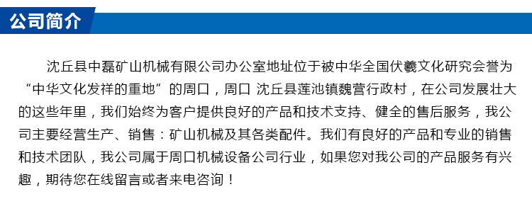 沈丘縣中磊礦山機(jī)械有限公司辦公室地址位于被中華全國伏羲文化研究會(huì)譽(yù)為“中華文化發(fā)祥的重地”的周口,周口 沈丘縣蓮池鎮(zhèn)魏營行政村,在公司發(fā)展壯大的這些年里,我們始終為客戶提供良好的產(chǎn)品和技術(shù)支持、健全的售后服務(wù),我公司主要經(jīng)營生產(chǎn)、銷售:礦山機(jī)械及其各類配件。我們有良好的產(chǎn)品和專業(yè)的銷售和技術(shù)團(tuán)隊(duì),我公司屬于周口機(jī)械設(shè)備公司行業(yè),如果您對(duì)我公司的產(chǎn)品服務(wù)有興趣,期待您在線留言或者來電咨詢!