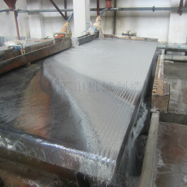 搖床床面外形呈直角梯形,在木制框架內(nèi),木板沿斜向(與軸線交角45度)拼成平面。床面分漆灰刻槽床面及橡膠床面兩種。漆灰刻槽床面用于選別細(xì)泥,橡膠床面則用于選別粗礦。用于選取細(xì)泥的搖床面沿縱向有0.5度左右的向下傾斜,用于選別粗砂的搖床則在縱向有1-2度的傾斜,在精礦端抬高?v向坡度的大小借支撐機構(gòu)上的螺栓調(diào)節(jié)。